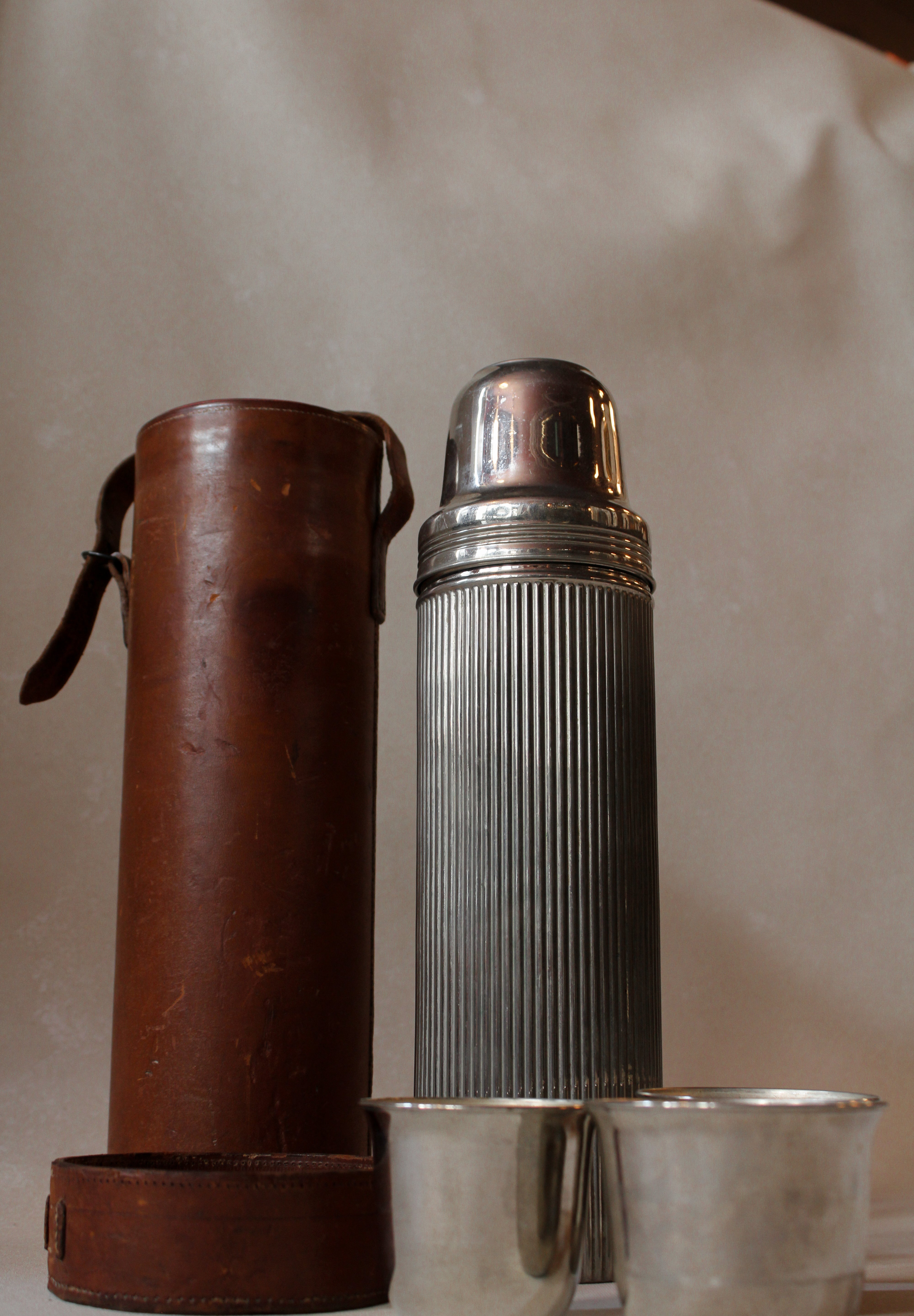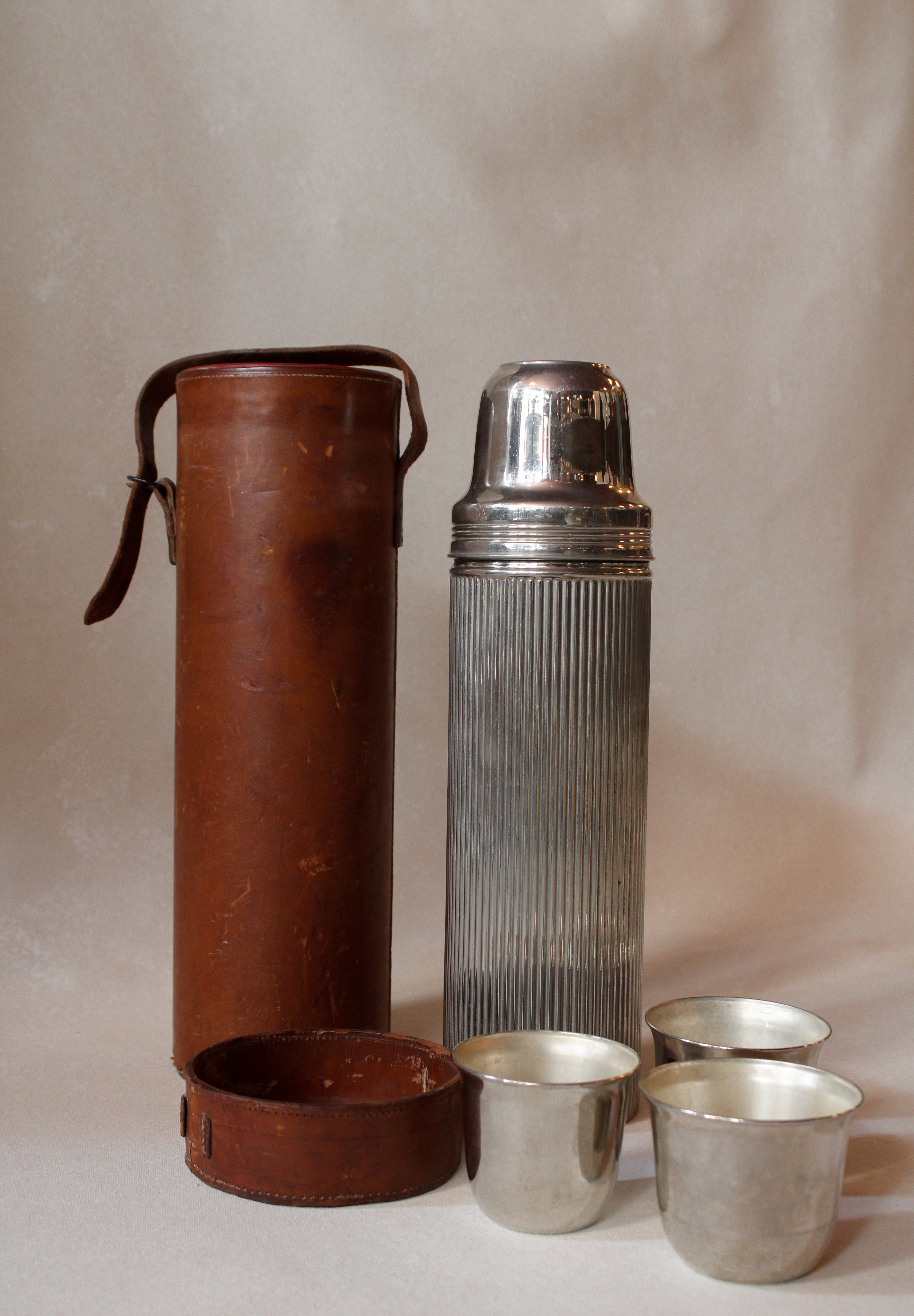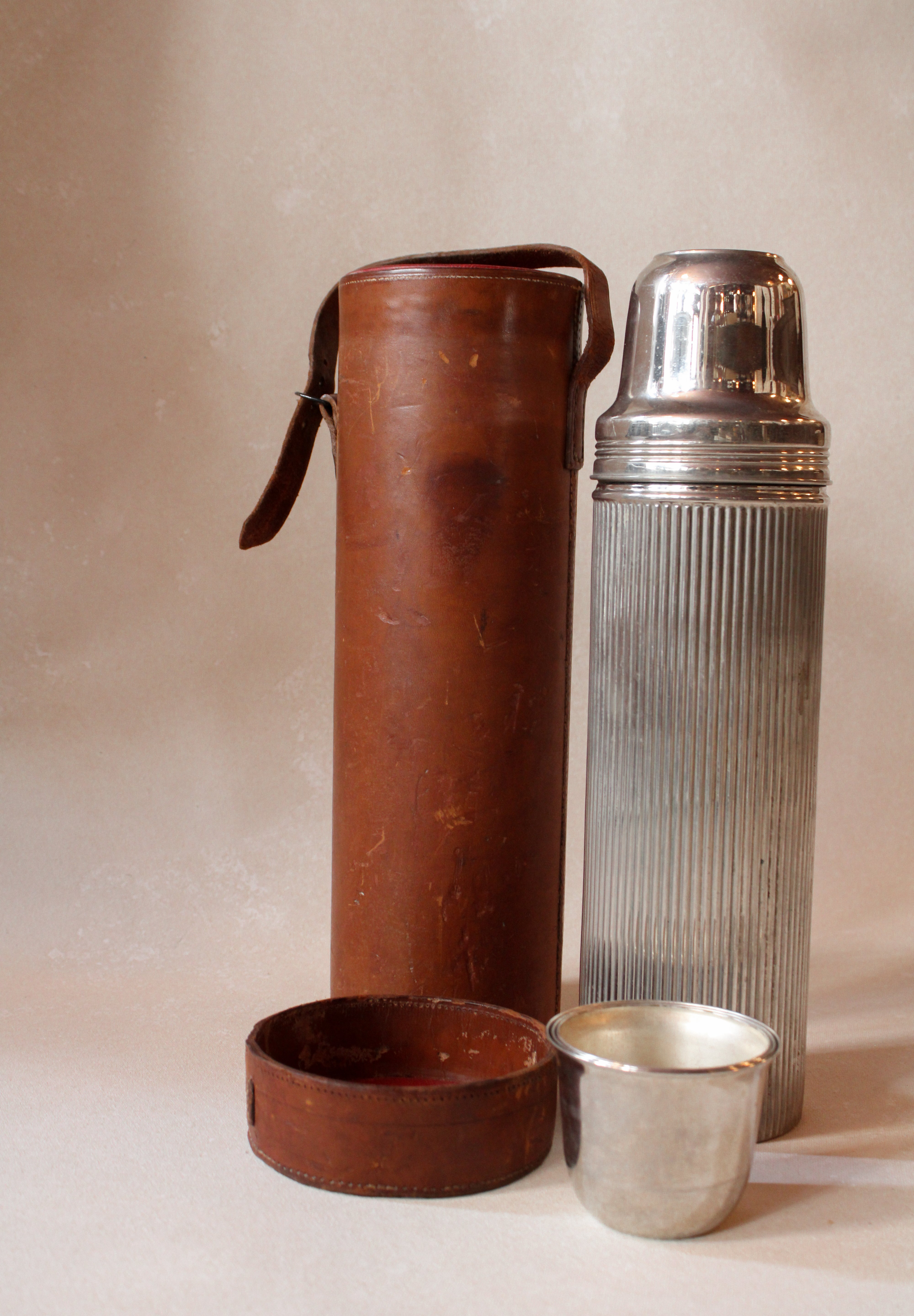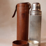 Experience the refined practicality of the 1916 Universal Thermos, an antique travel essential crafted by Landers Frary & Clarke in the USA. This hot water bottle features a glass-lined flask designed to maintain temperature while preserving purity and flavor. Encased in a luxurious leather travel sleeve, it includes matching cups for convenient sipping on the go. Blending sophisticated design with durable craftsmanship, this vintage thermos offers both style and functionality for discerning travelers who appreciate timeless quality and elegance in their accessories.