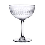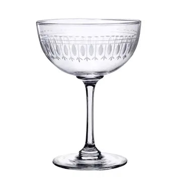 This set includes four cocktail glasses, each featuring a hand-cut band of linked ovals. Expertly hand-blown and hand-cut from high-quality lead-free crystal, these glasses offer elegance and durability. Plus, they are dishwasher safe for easy care.