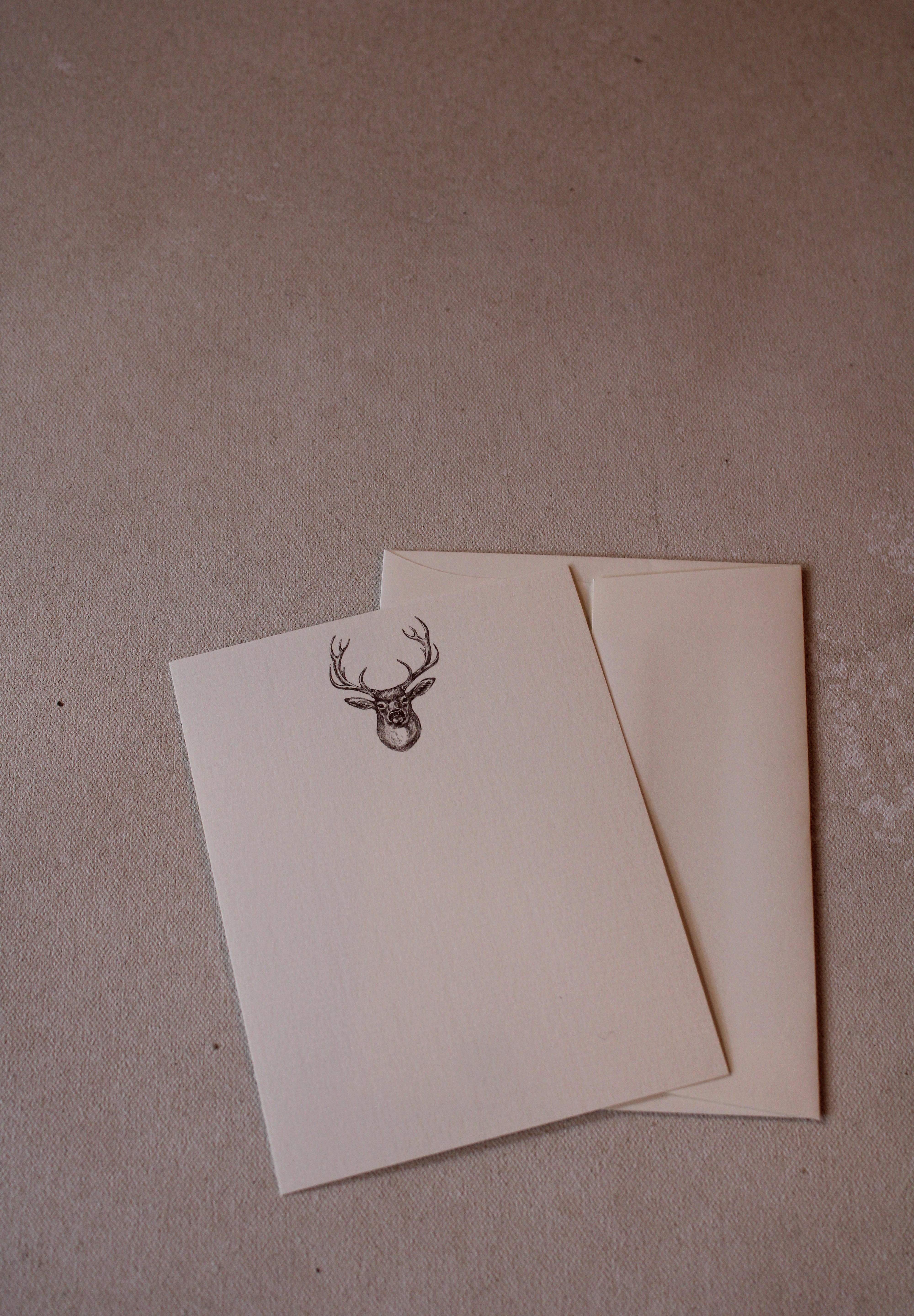 Convey your messages with sophistication using these Deer A2 Notes. The hand-drawn majestic deer design is flat printed with eco-friendly, soy-based ink on premium USA-made Ecru textured Laid 80# Cover stock paper. Each piece is thoughtfully designed and printed in New Orleans..