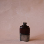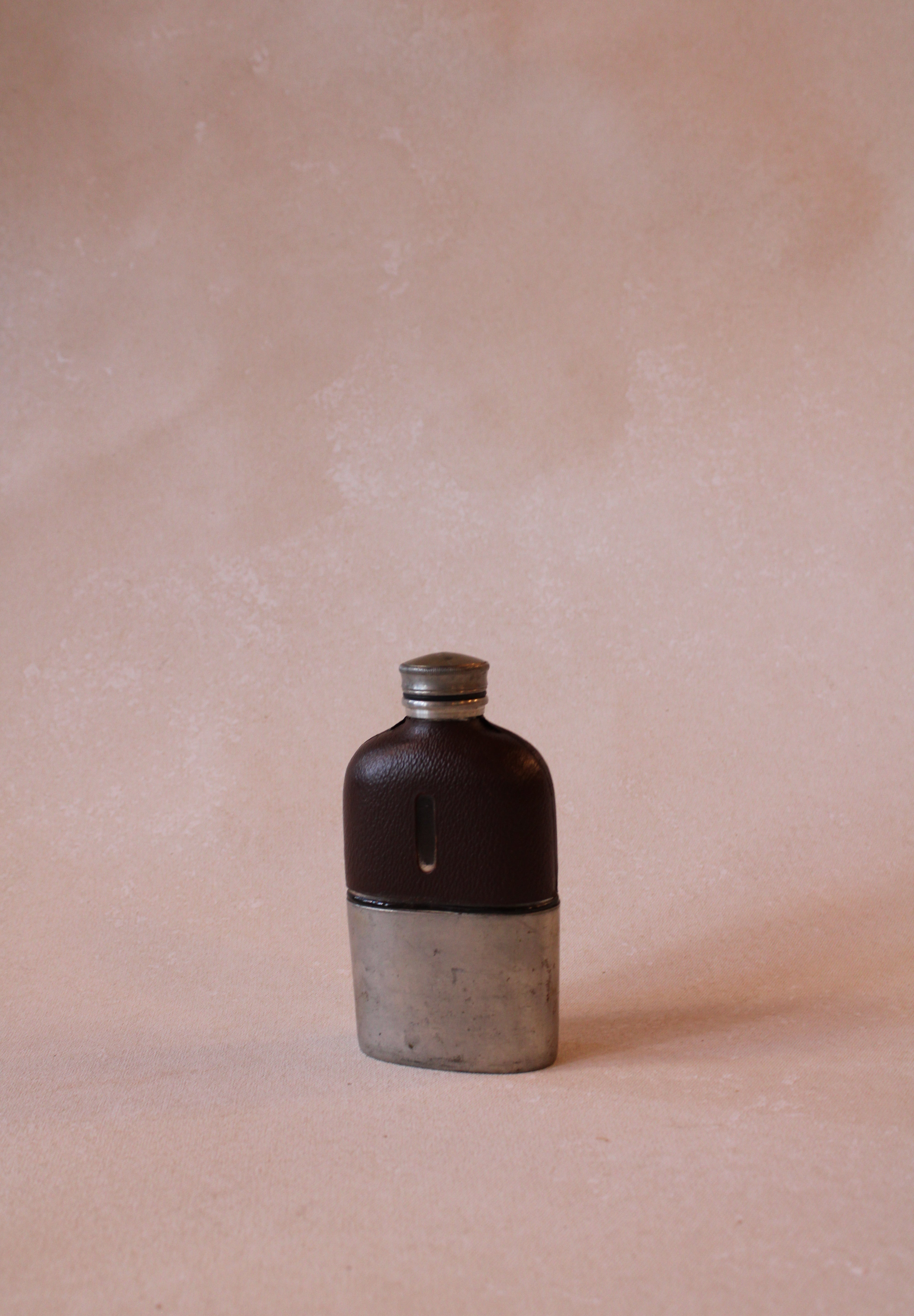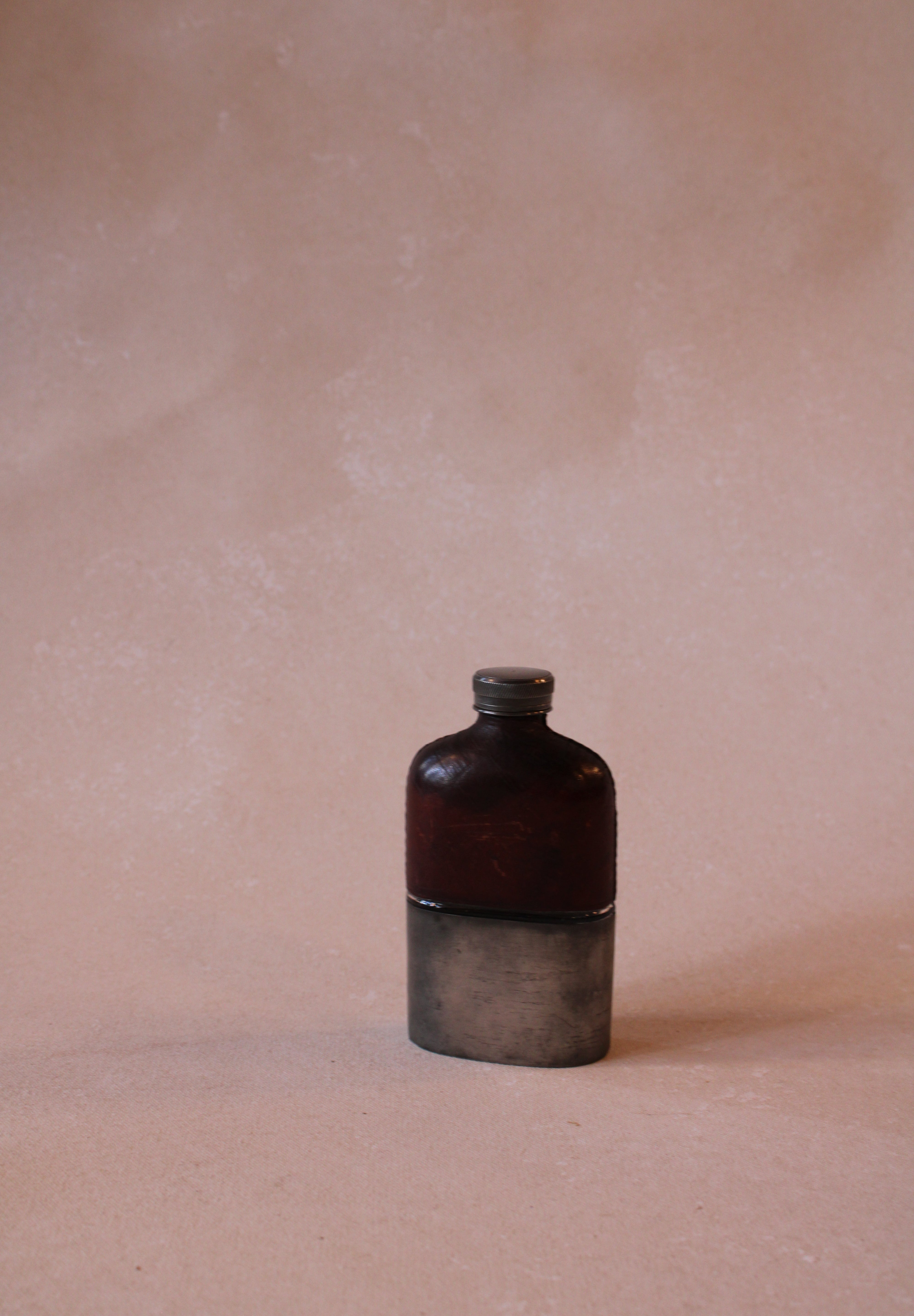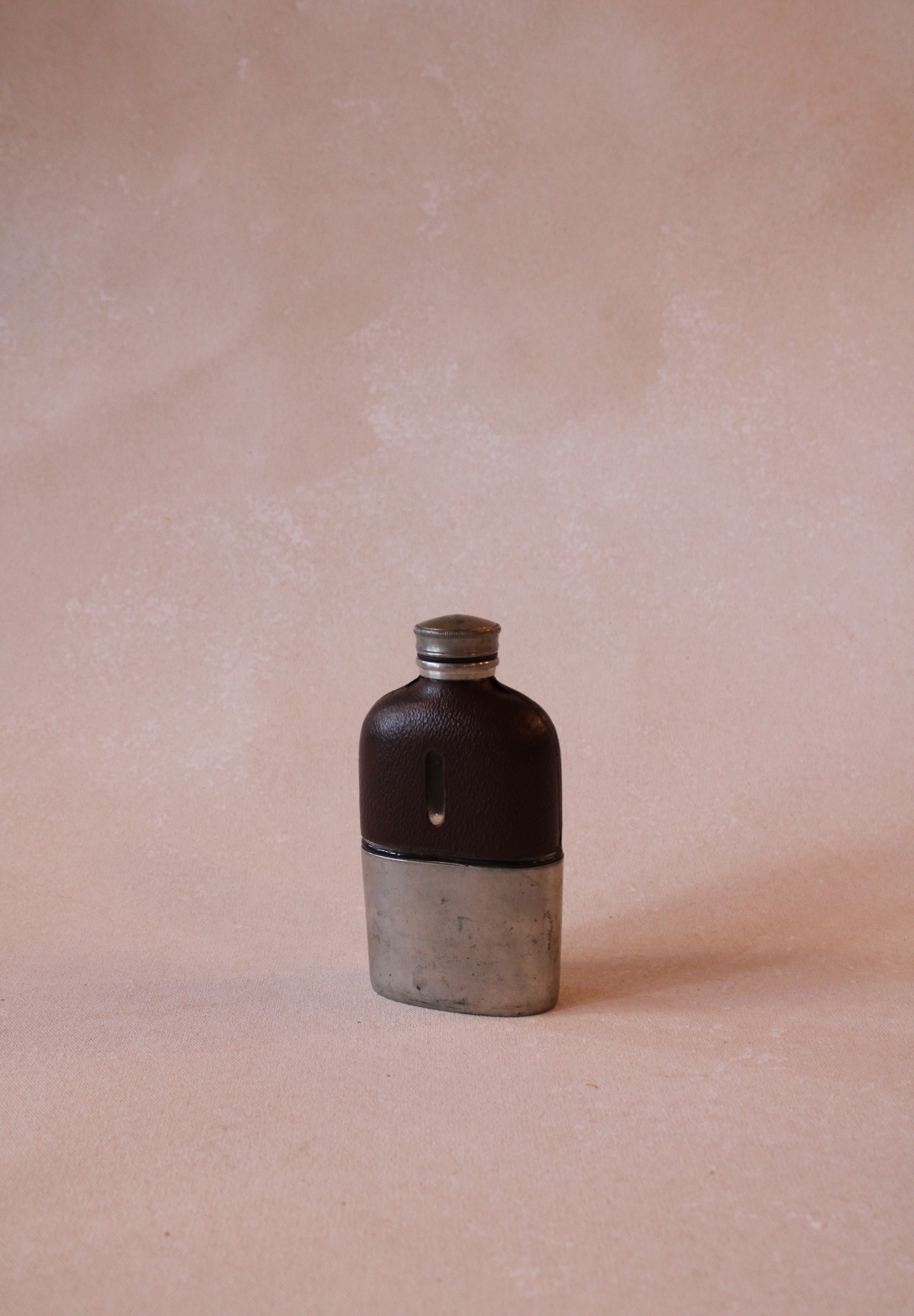 Vintage Leather and Pewter Cased Glass Bottle Travel Hip Flask