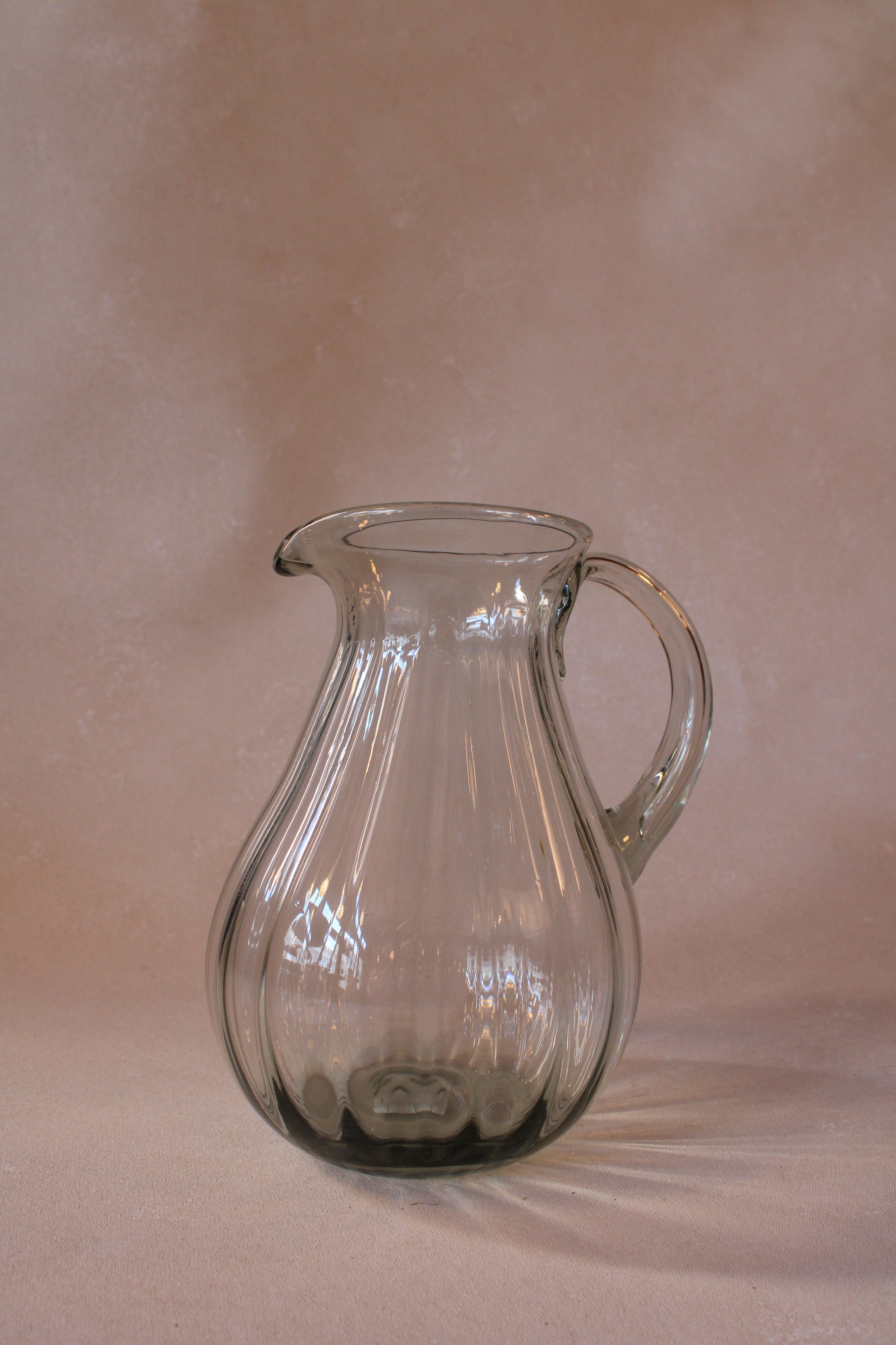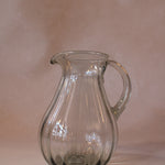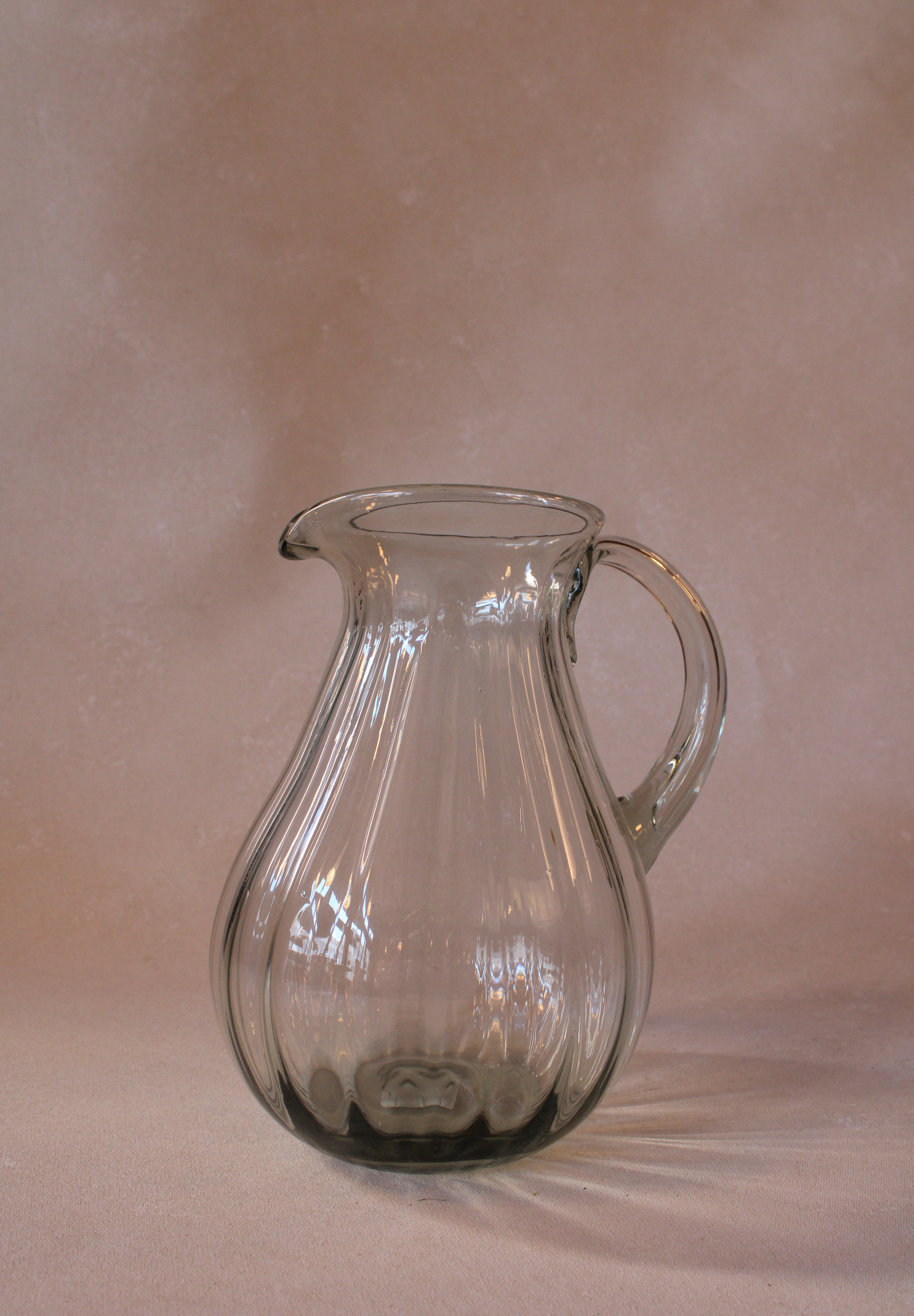 Handblown Fluted Pitcher. Each piece is uniquely crafted by hand, resulting in variations in shape and size alongside subtle imperfections such as air bubbles, black specks, pontil marks, hand tooling details, and irregularities in glass or color patterns. These distinctive characteristics highlight the artistry and individuality of handmade craftsmanship, making every pitcher truly one of a kind and cherished for its authentic beauty.