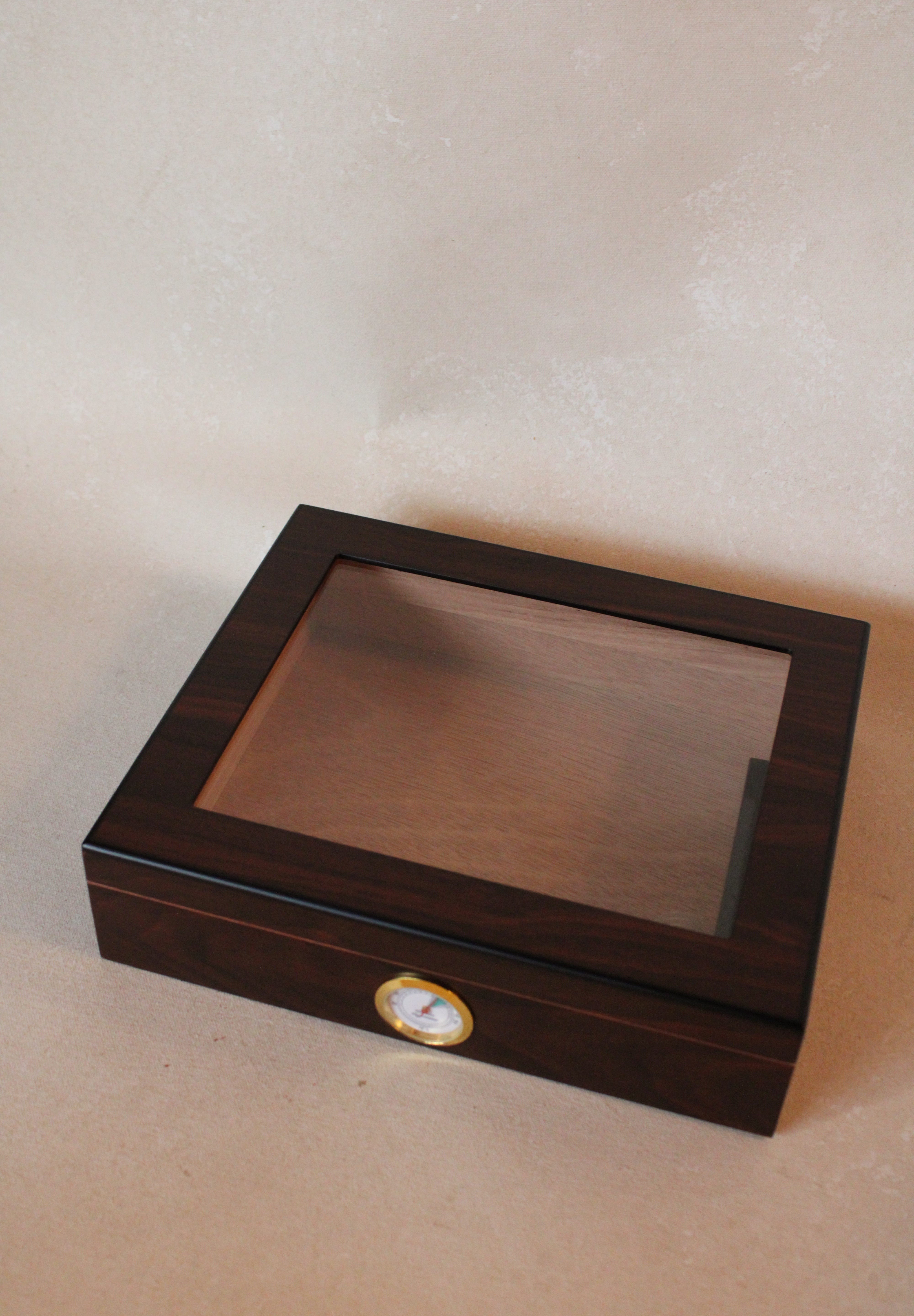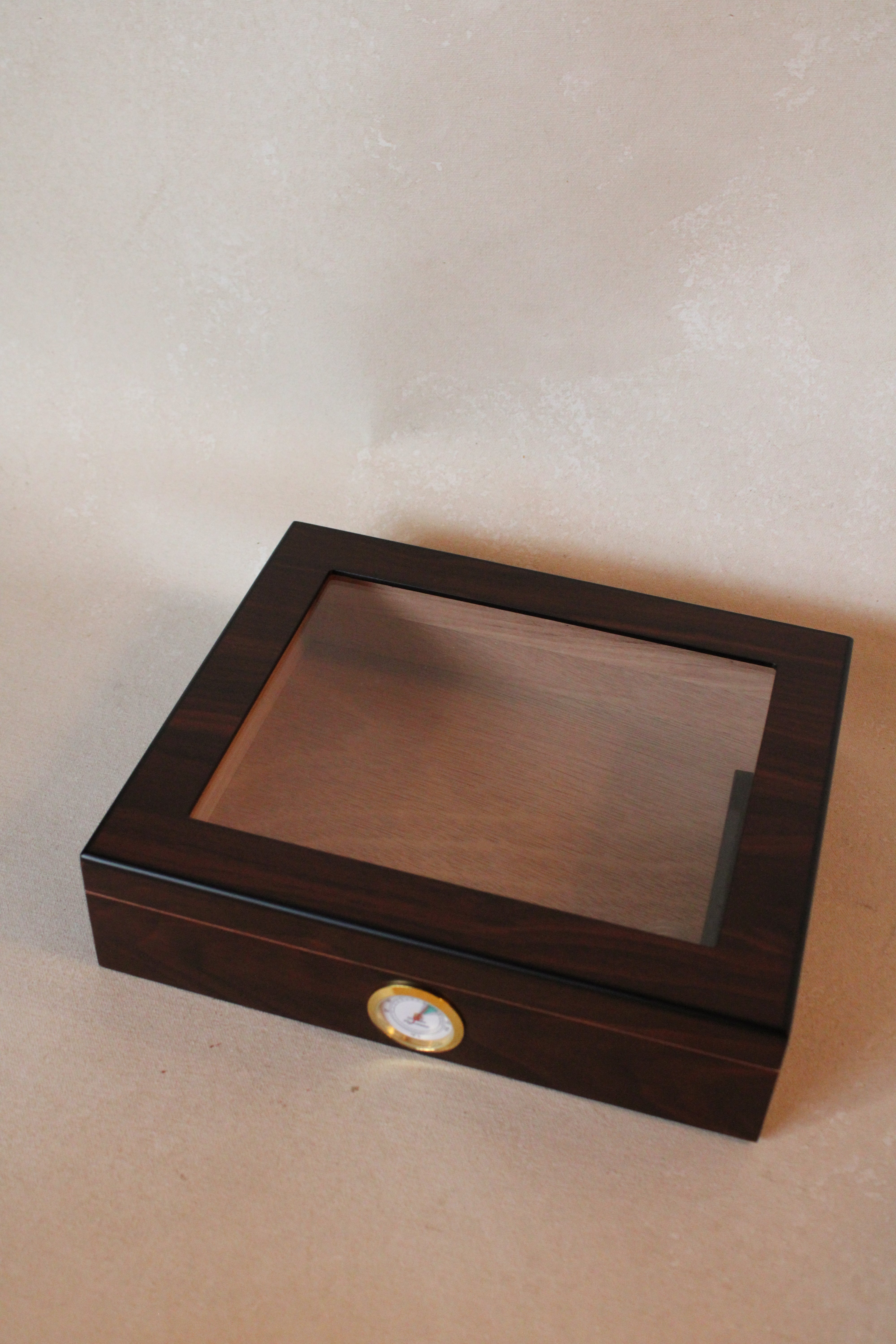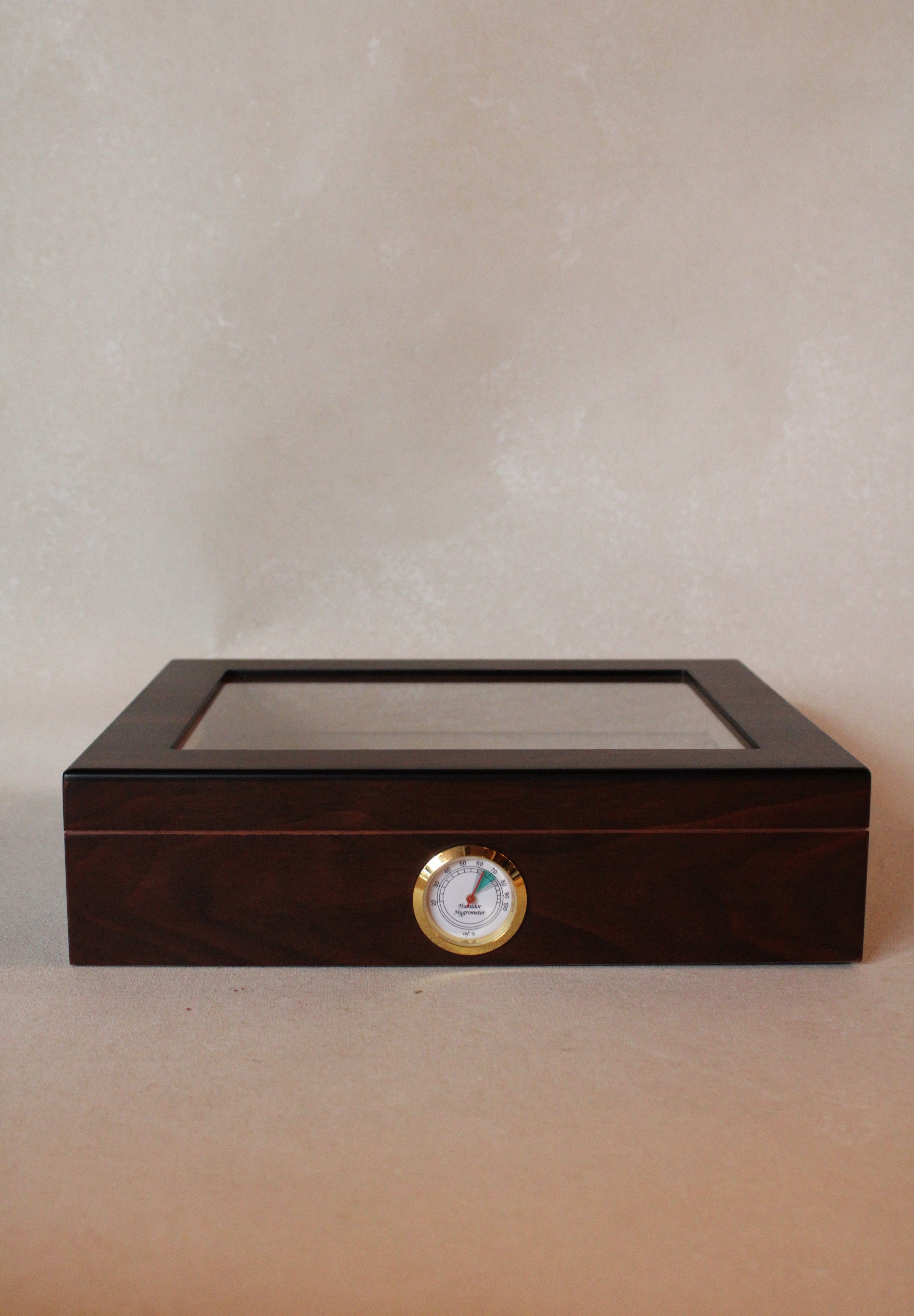 Presenting the Finley Walnut 12 Cigar Humidor, a refined storage solution tailored for the discerning cigar aficionado. Crafted with a luxurious walnut finish, this humidor elegantly complements any setting while providing secure accommodation for up to 12 cigars. Equipped with a precise hygrometer, it enables you to maintain ideal humidity levels, ensuring your cigars age gracefully and retain their full flavor. Beyond its aesthetic appeal, this humidor represents a commitment to quality and reliability, making it an essential addition for those who appreciate the art of cigar preservation.