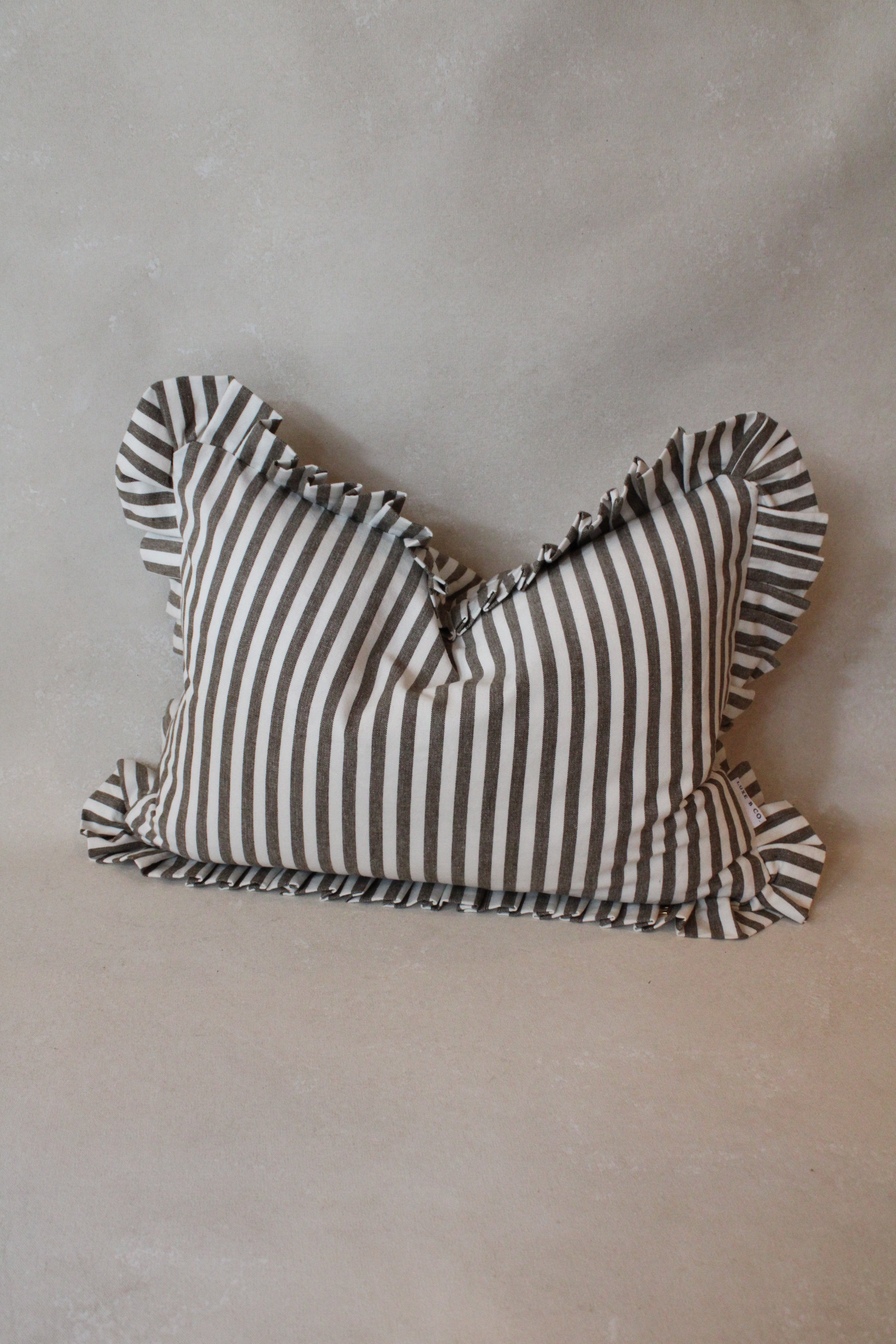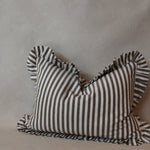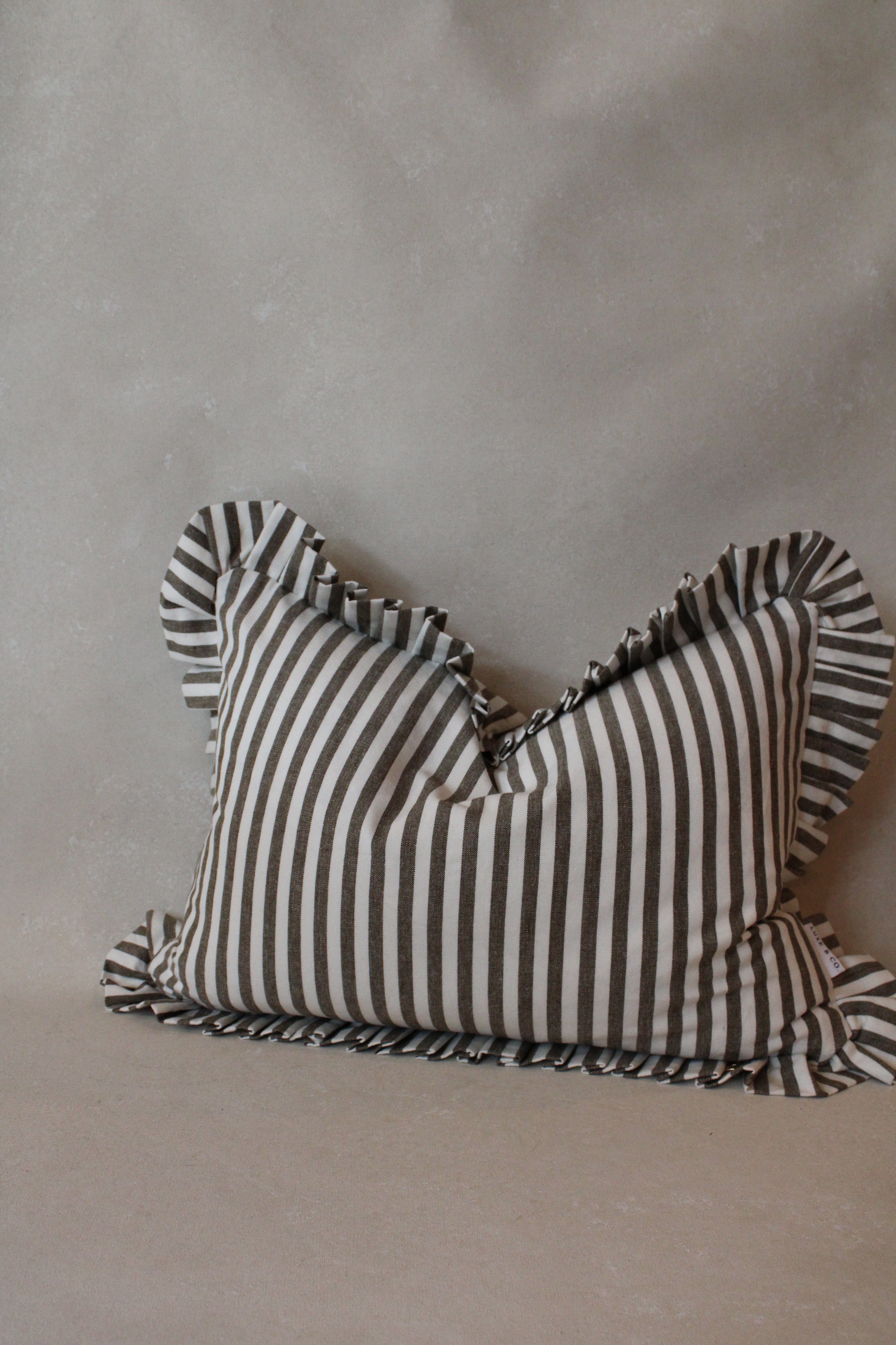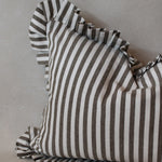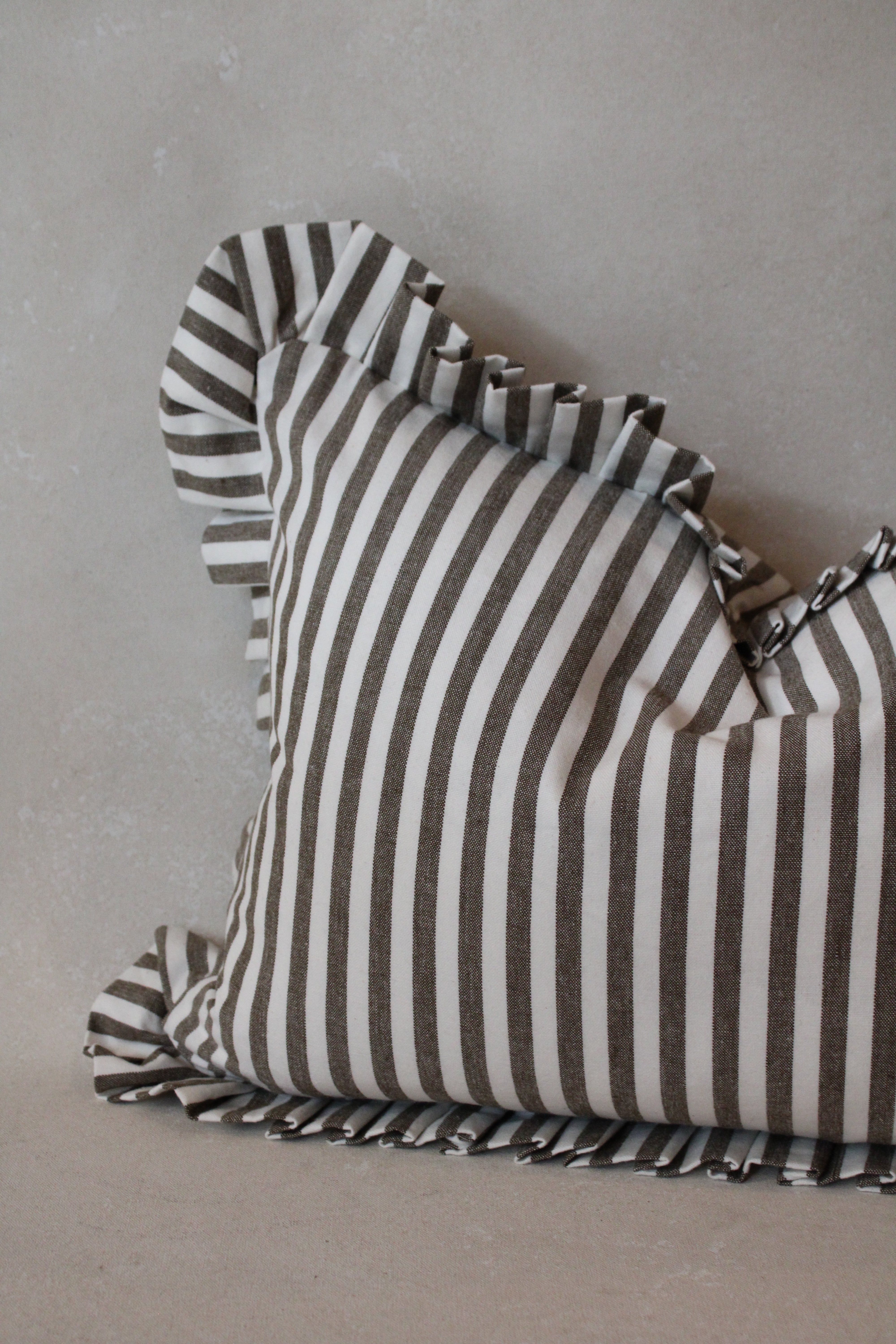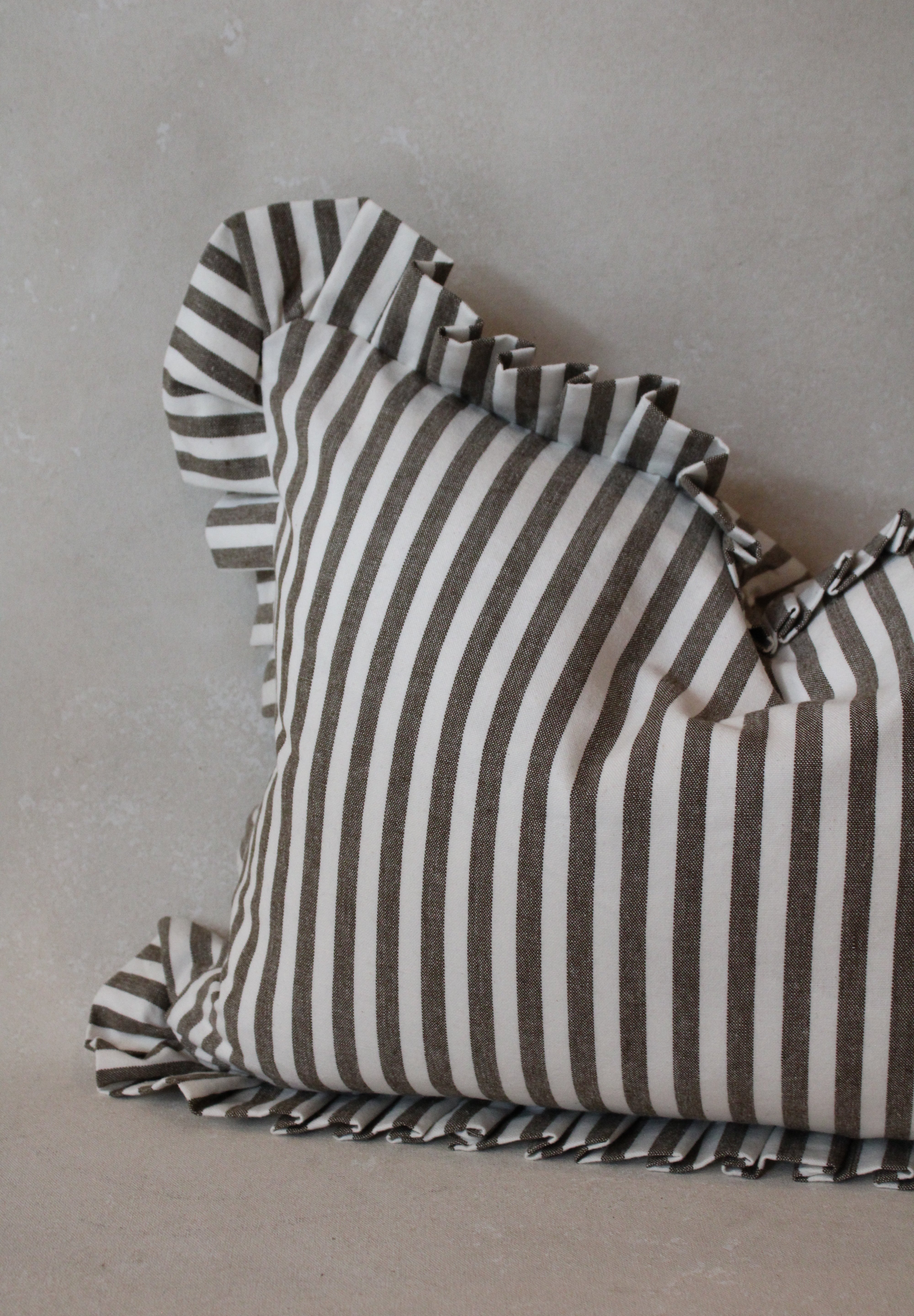 Enhance any room with the sophisticated Ruffle Lumbar Pillow Cover in Olive Green and White Stripes. Made from premium cotton, this cover showcases a distinctive ruffled edge paired with a chic striped pattern. Designed to elevate your interior decor, it features a concealed zip closure for a seamless look. As a handmade item, please allow for a slight size variation of up to 2 cm.