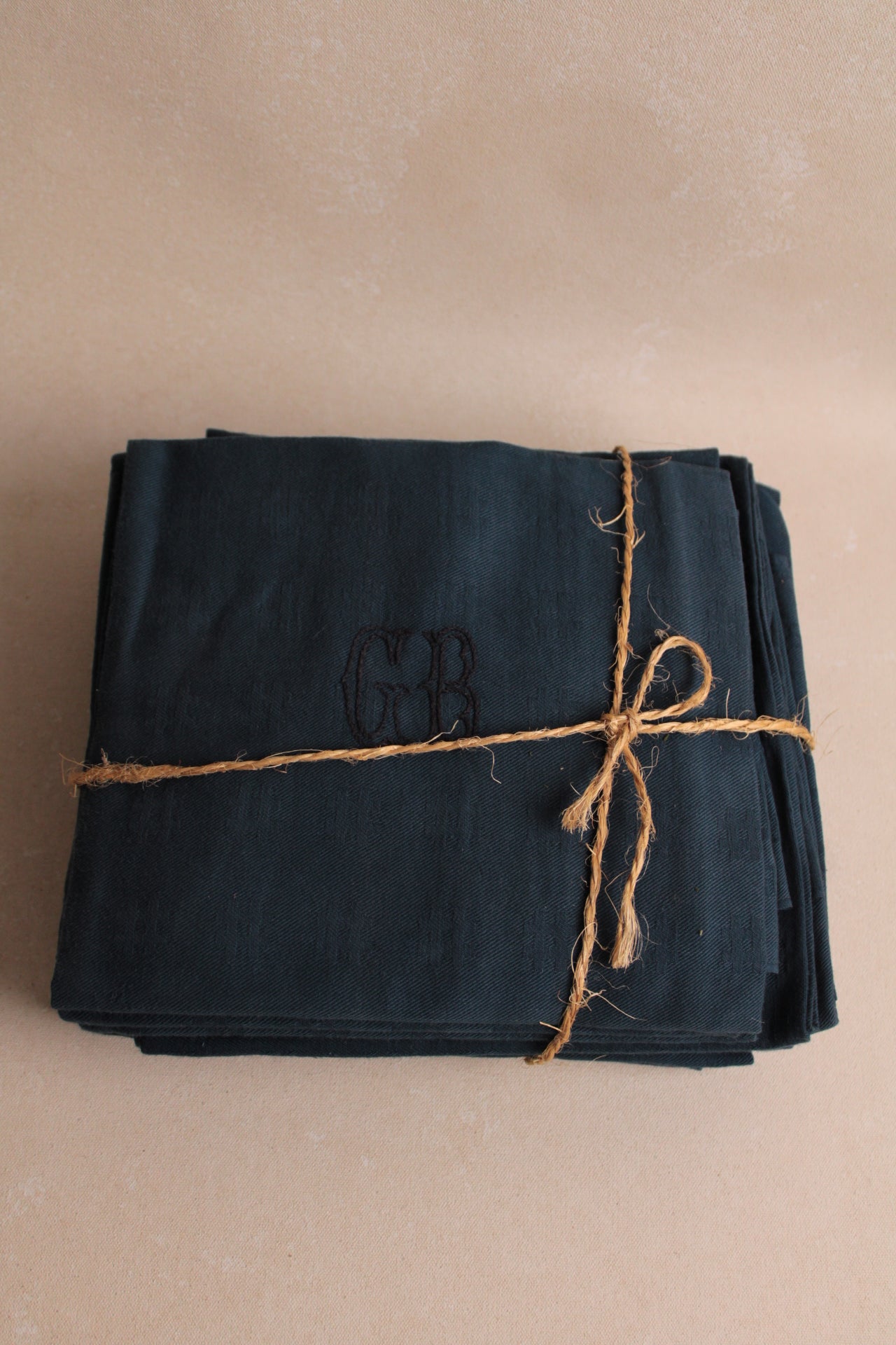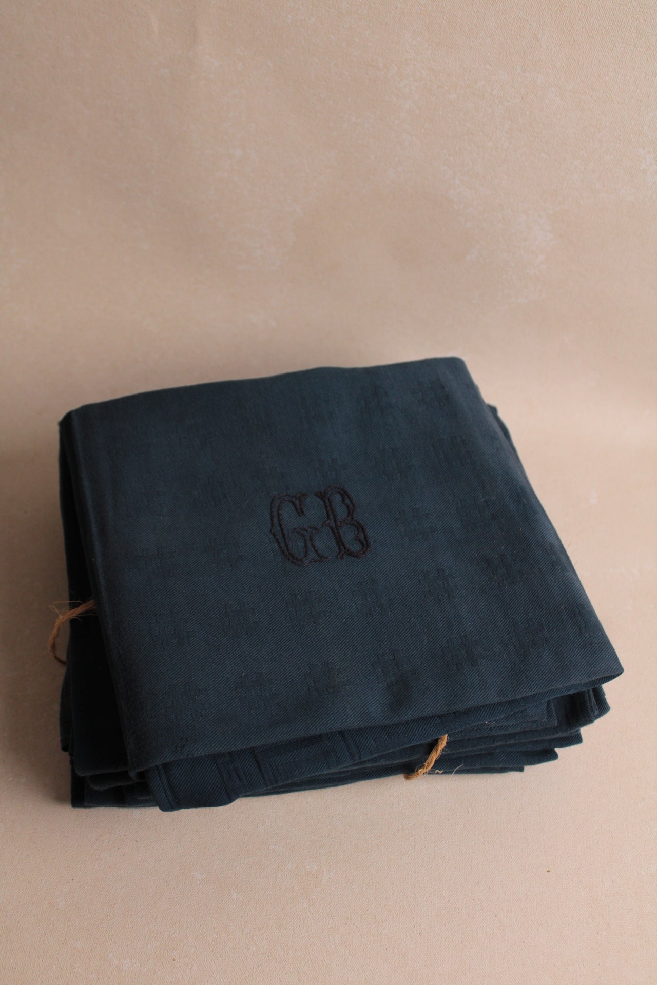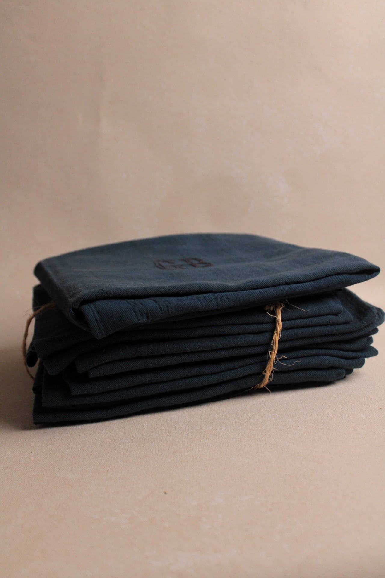 Timeless navy napkins adorned with delicate GM embroidery, these heirloom pieces carry the charm of Provence craftsmanship. Each set represents generations of heritage, perfect for elevating your table with authentic French elegance and storied tradition. Set of 11.
