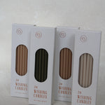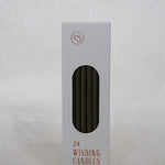 24 candles per box. Each candle is 6 inches tall (1/4 inch diameter) and burns for approximately 45 minutes.