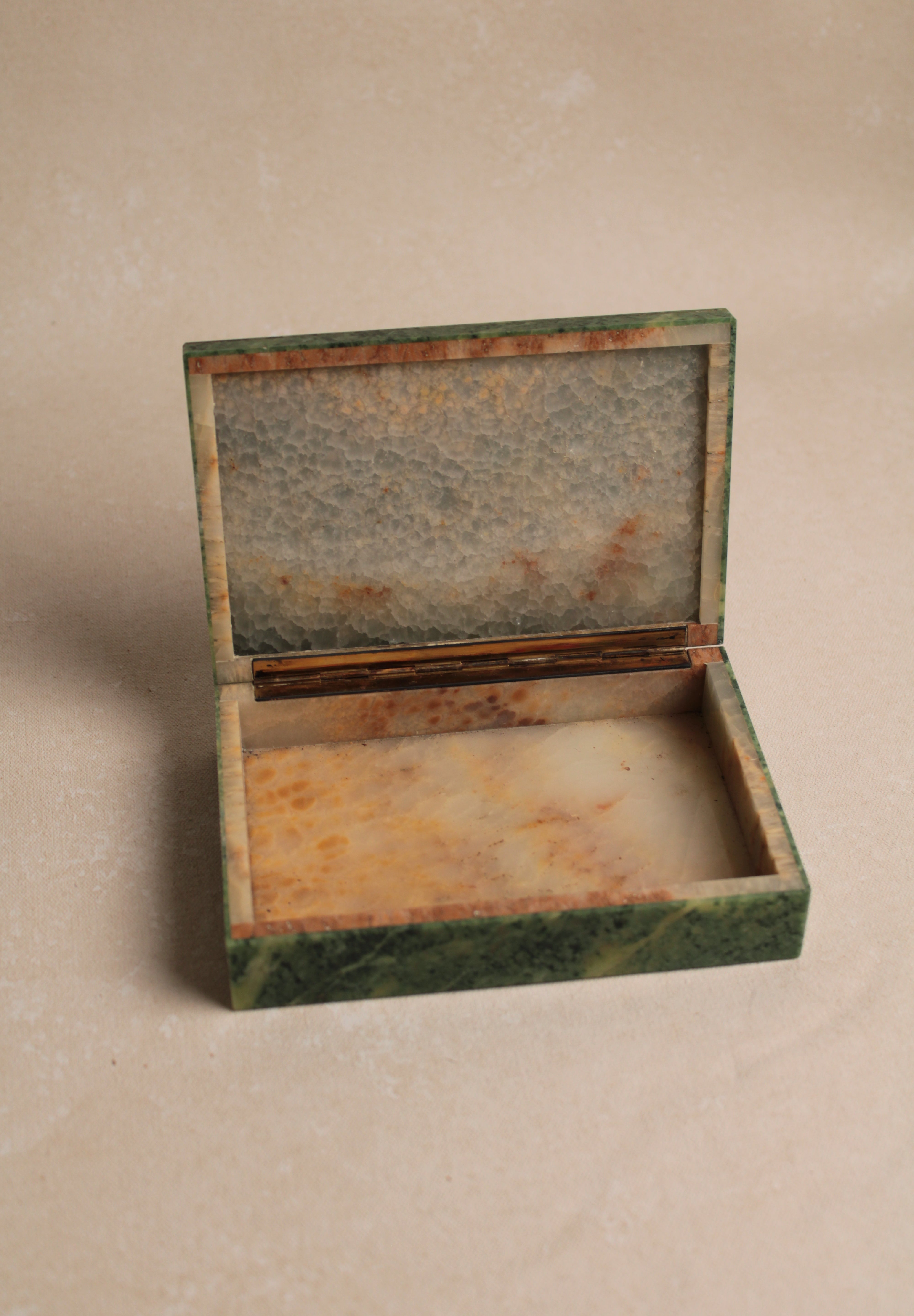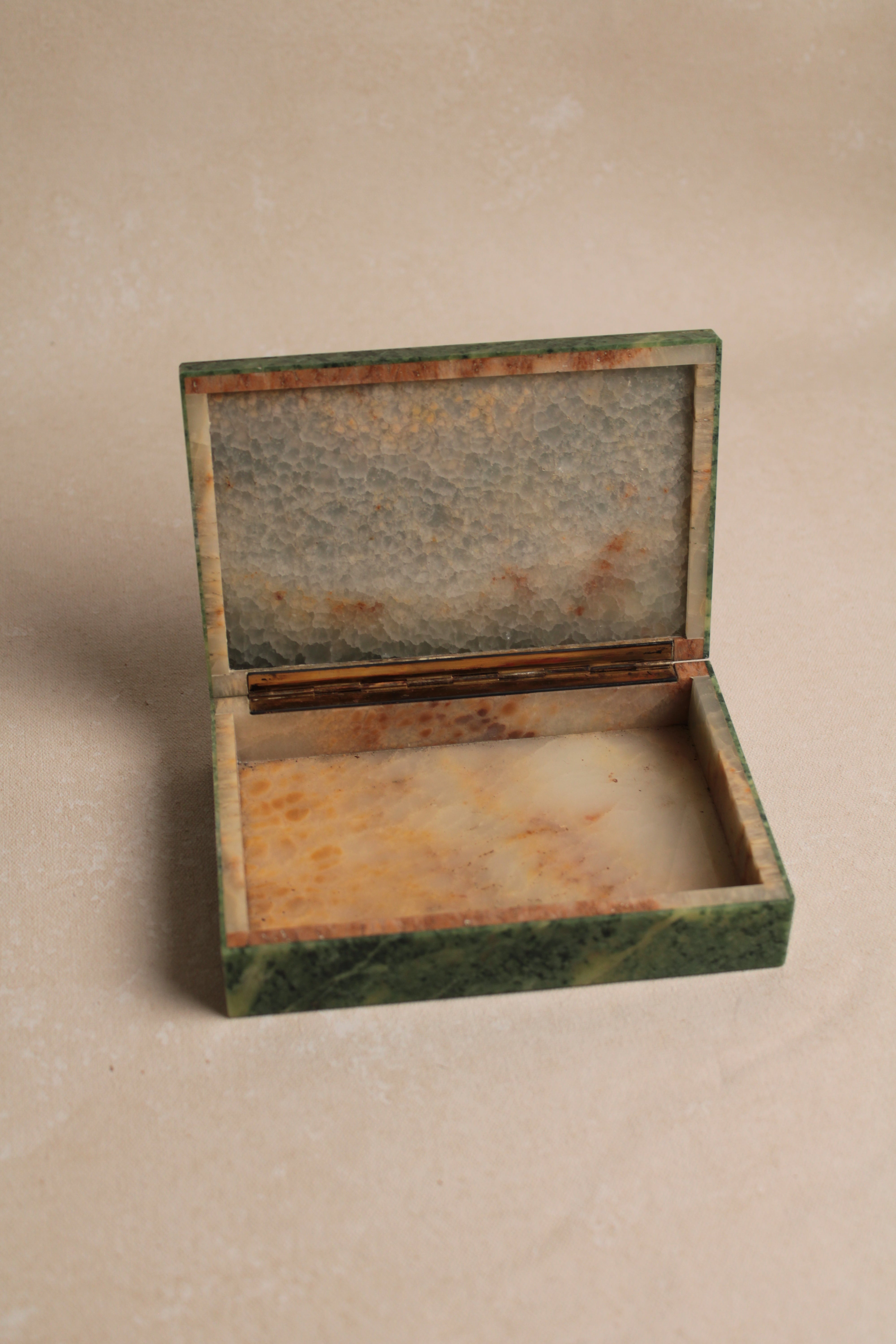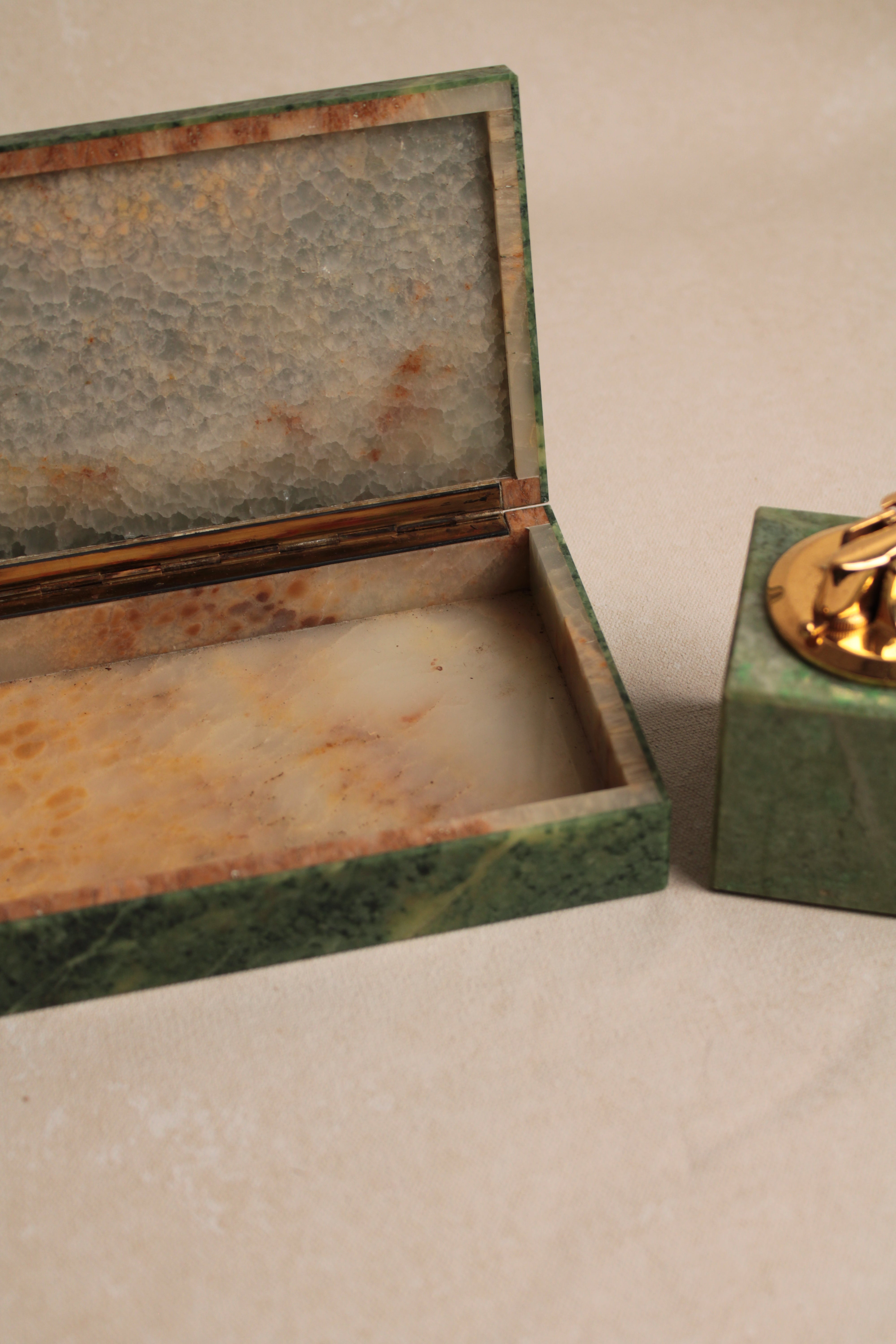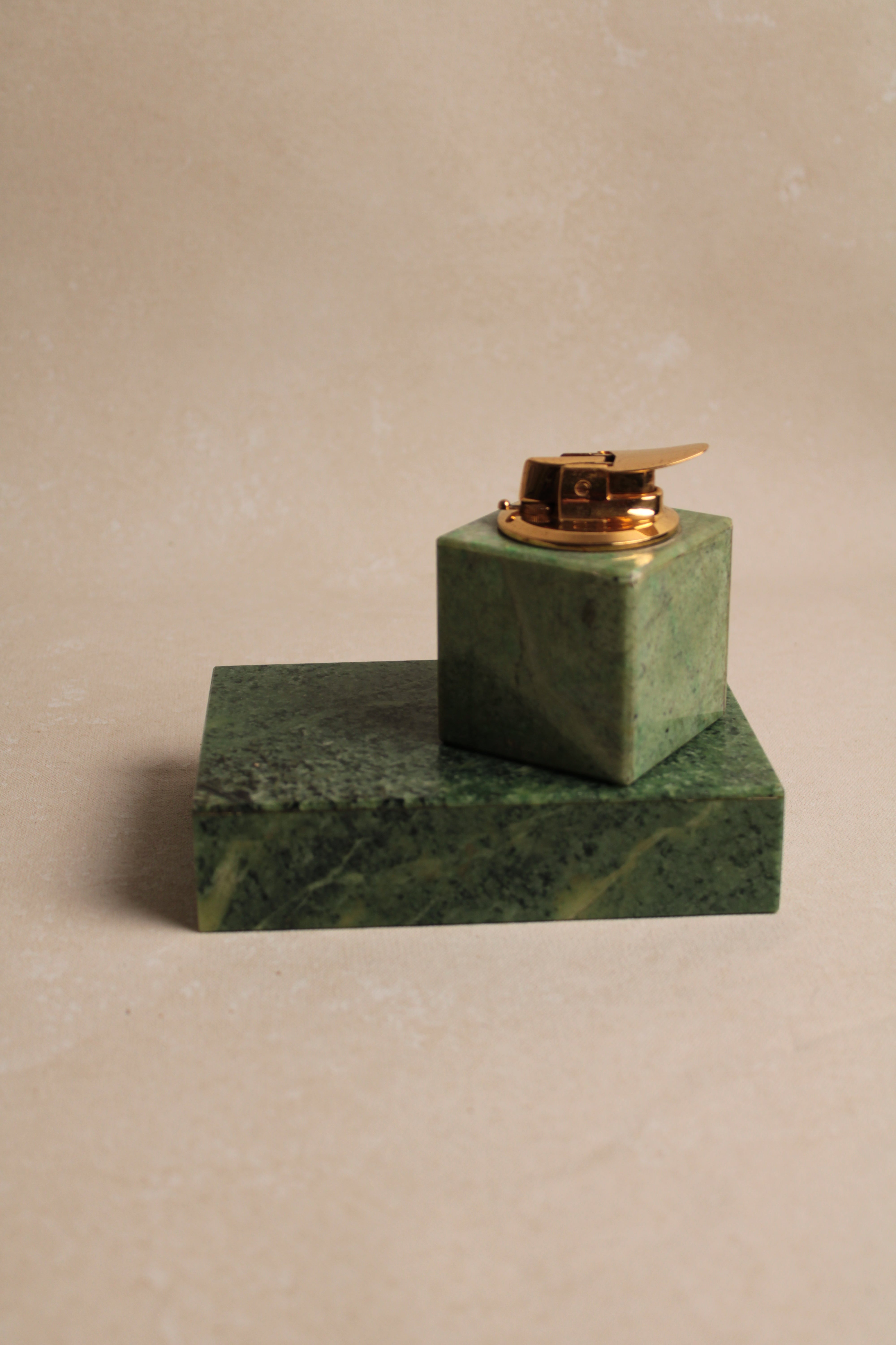 An exquisite pairing from the 1960s, this marble set combines a refillable lighter with a coordinating cigar box, representing the pinnacle of mid-century luxury and refinement. Crafted from elegant marble, each piece showcases the natural veining and timeless beauty characteristic of this noble material. The lighter's refillable mechanism ensures enduring functionality, while the cigar box provides sophisticated storage for premium tobacco. Together, they form a distinguished desk or bar accessory that captures the essence of post-war elegance. A coveted find for collectors of vintage smoking accessories and those who appreciate the marriage of form and function in classic design.
