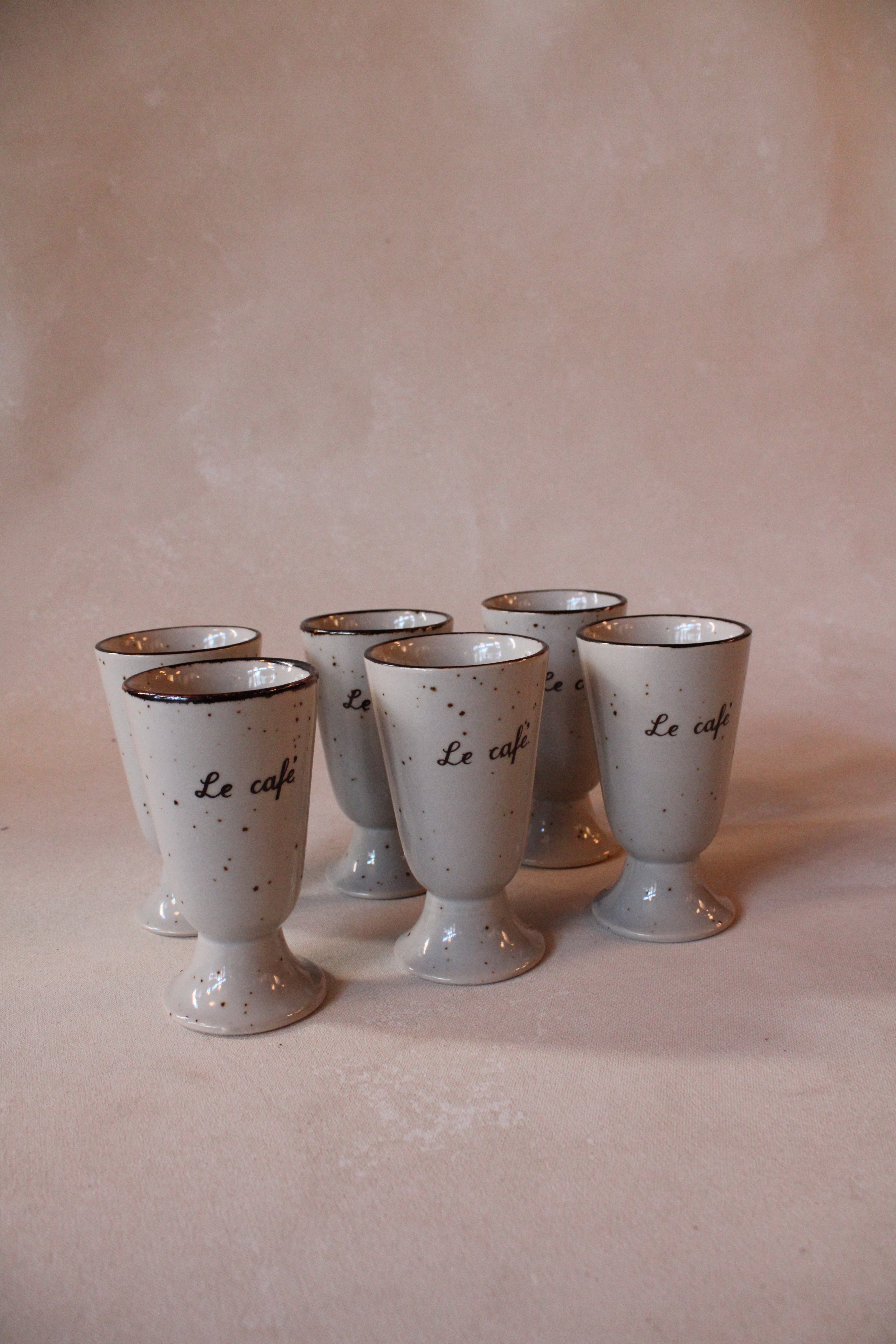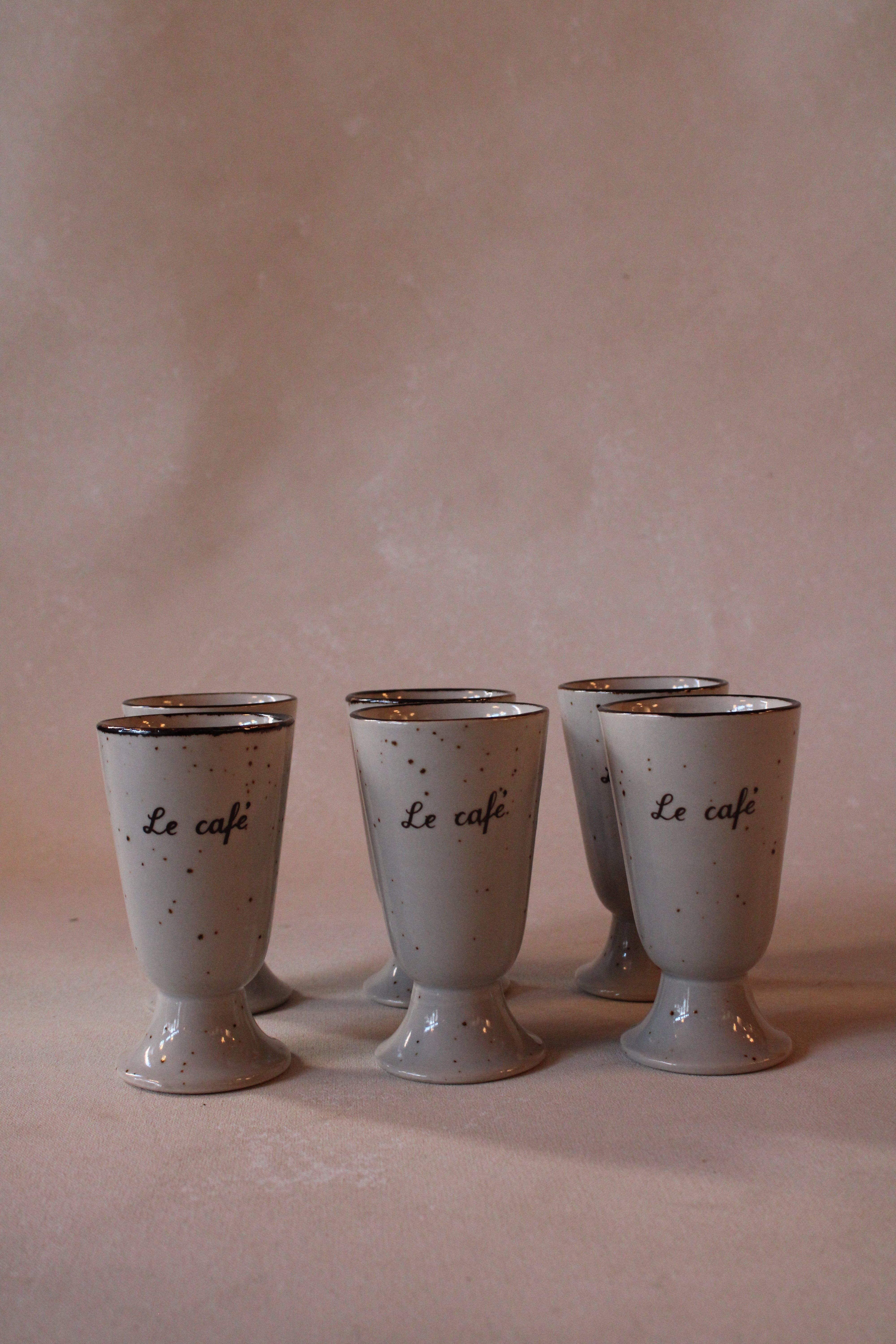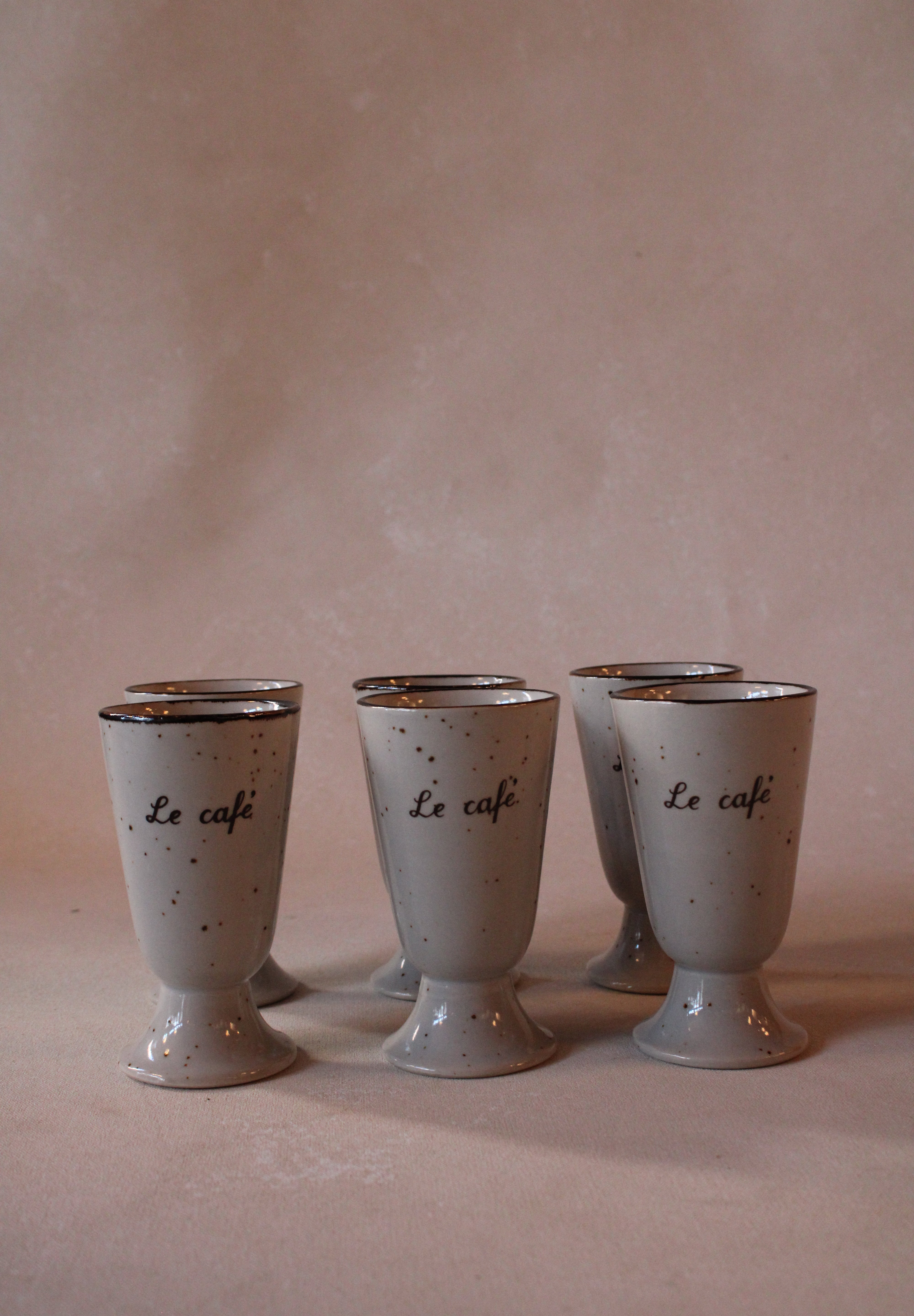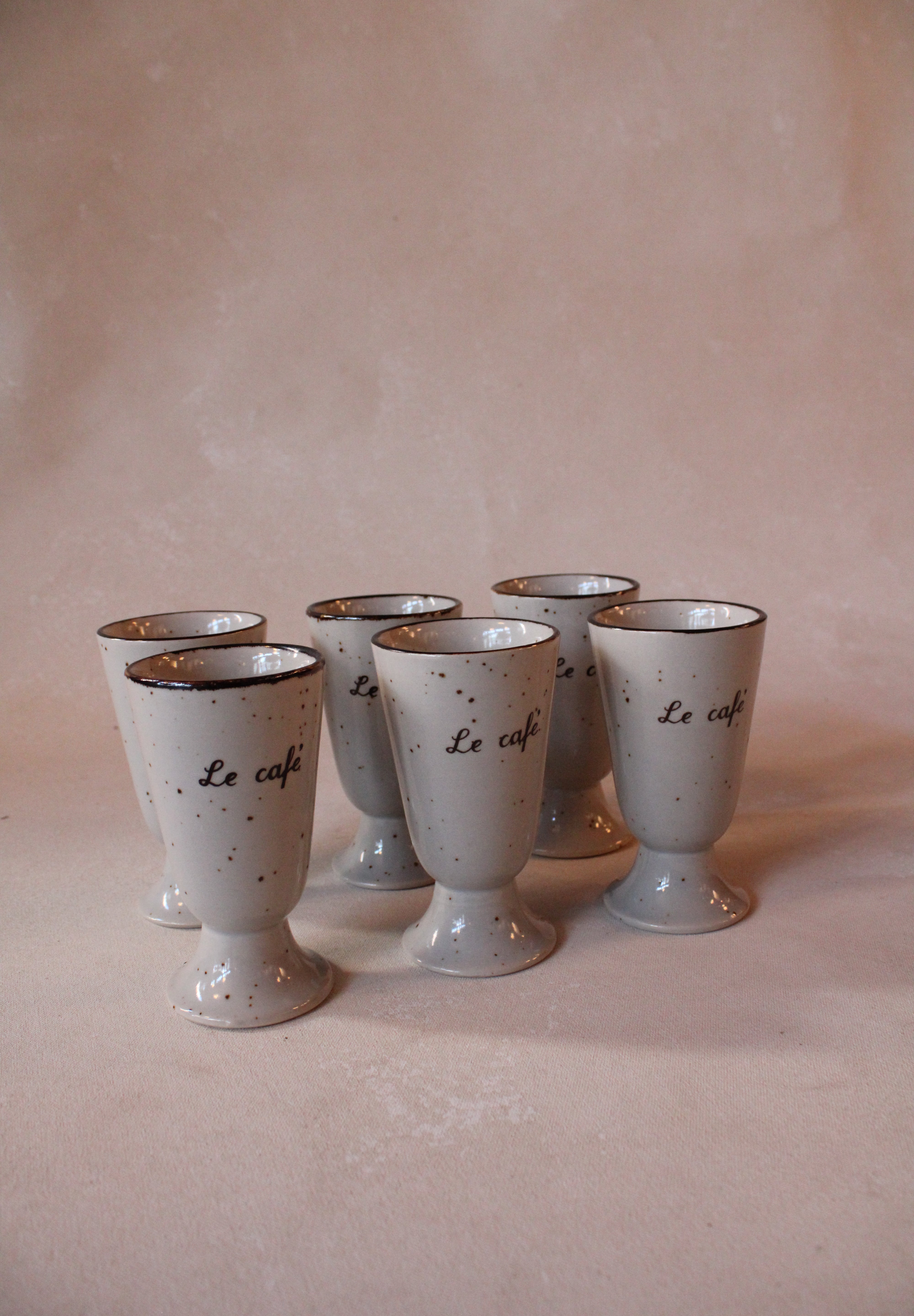 This set of six Midcentury French Mazagran coffee cups embodies classic elegance and retro charm. Each pedestal ceramic mug features a beige and brown speckled glaze, reminiscent of authentic French café culture. Their unique design not only adds visual interest but also ensures a comfortable grip and an enjoyable coffee experience. Ideal for both everyday use and stylish entertaining, these cups bring a sophisticated vintage flair to your table, enhancing your morning ritual or afternoon break with timeless French appeal.