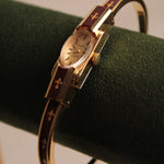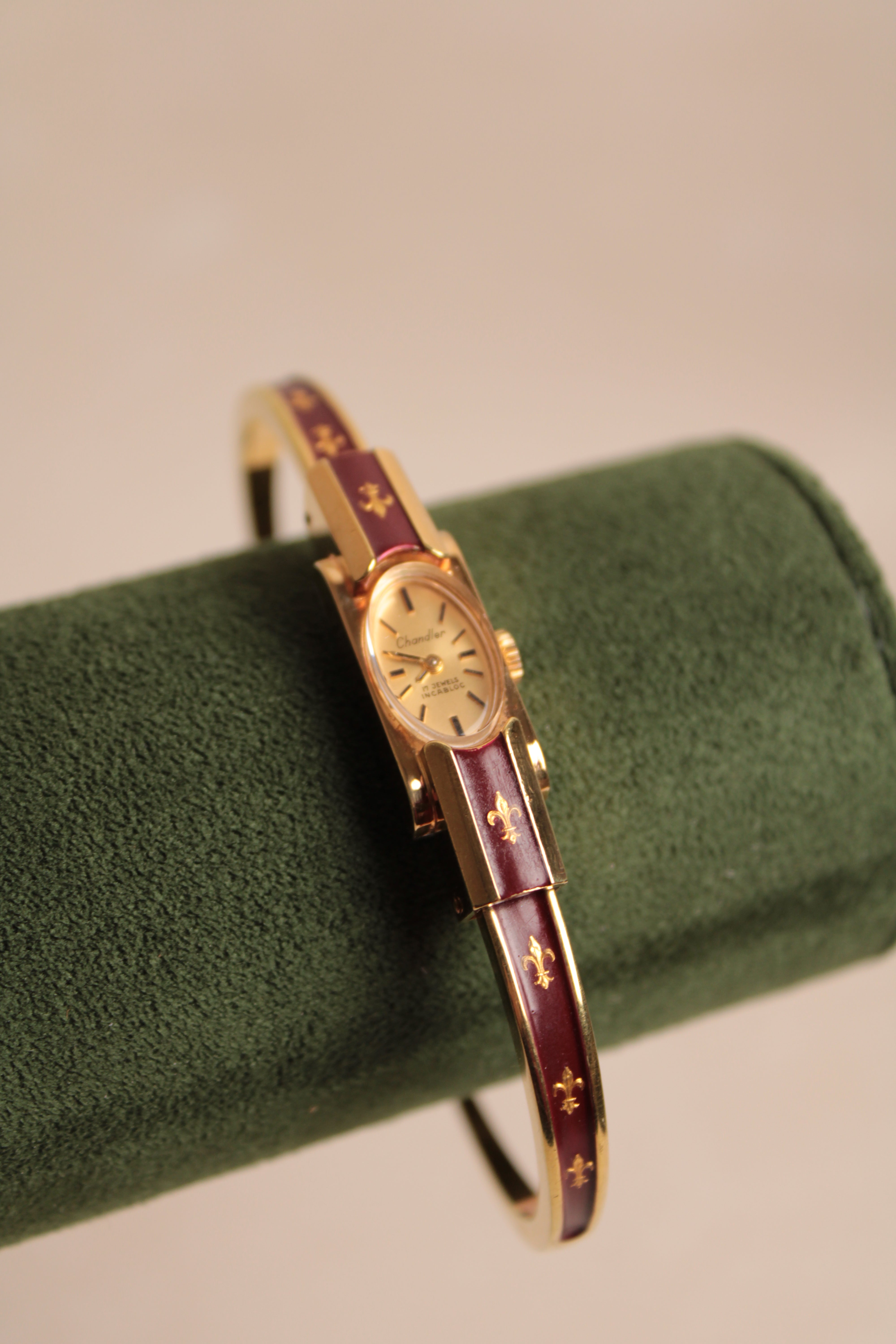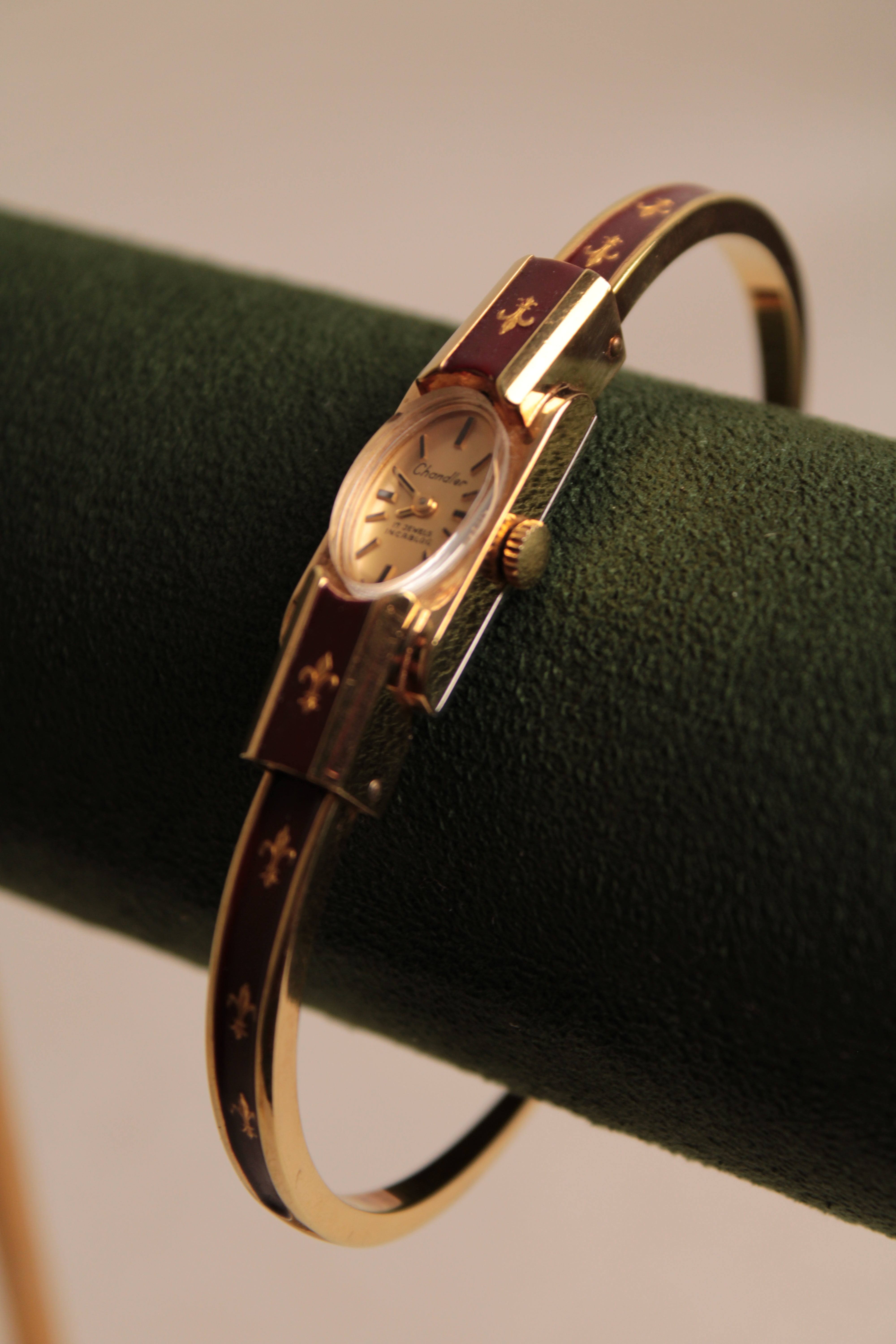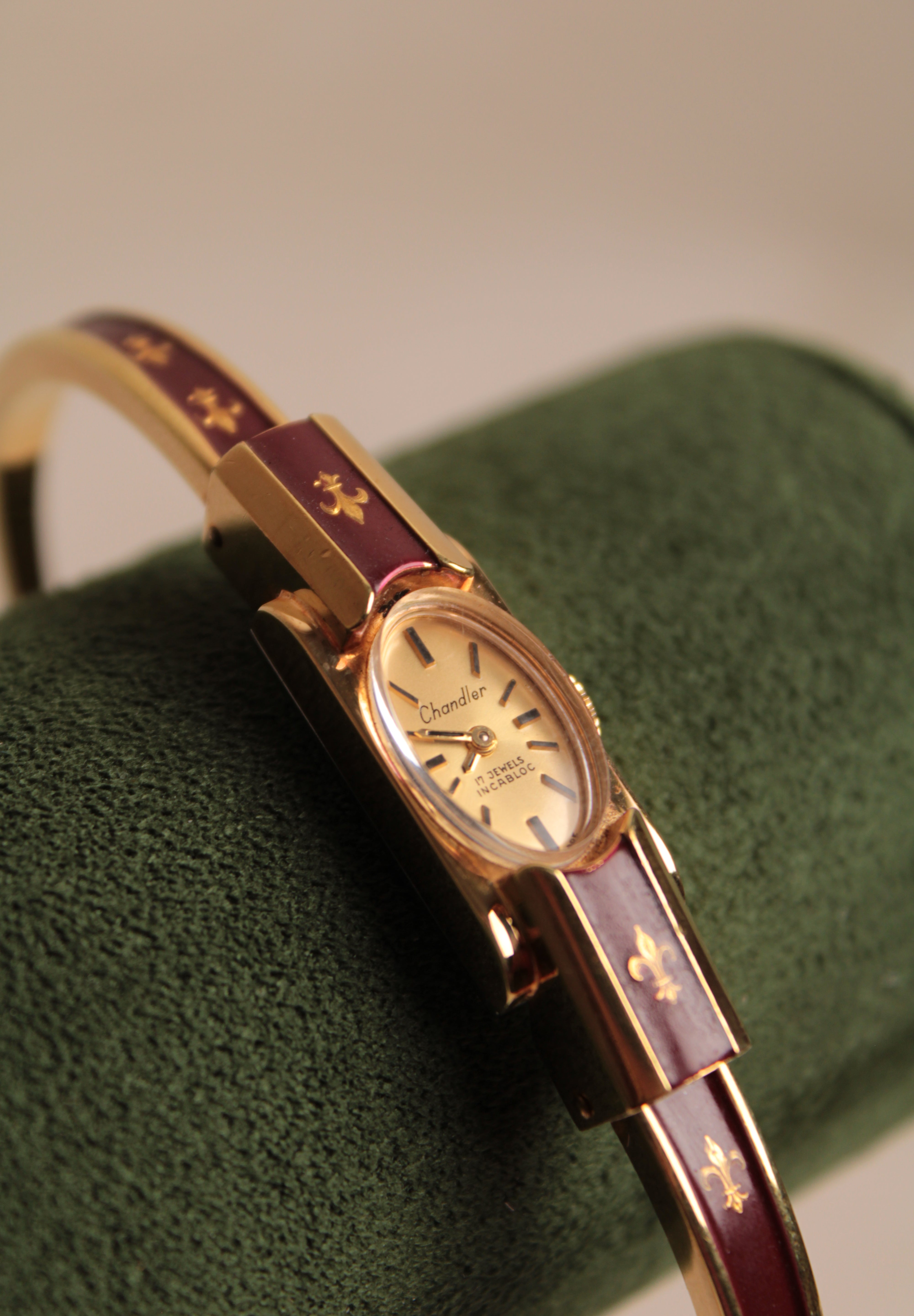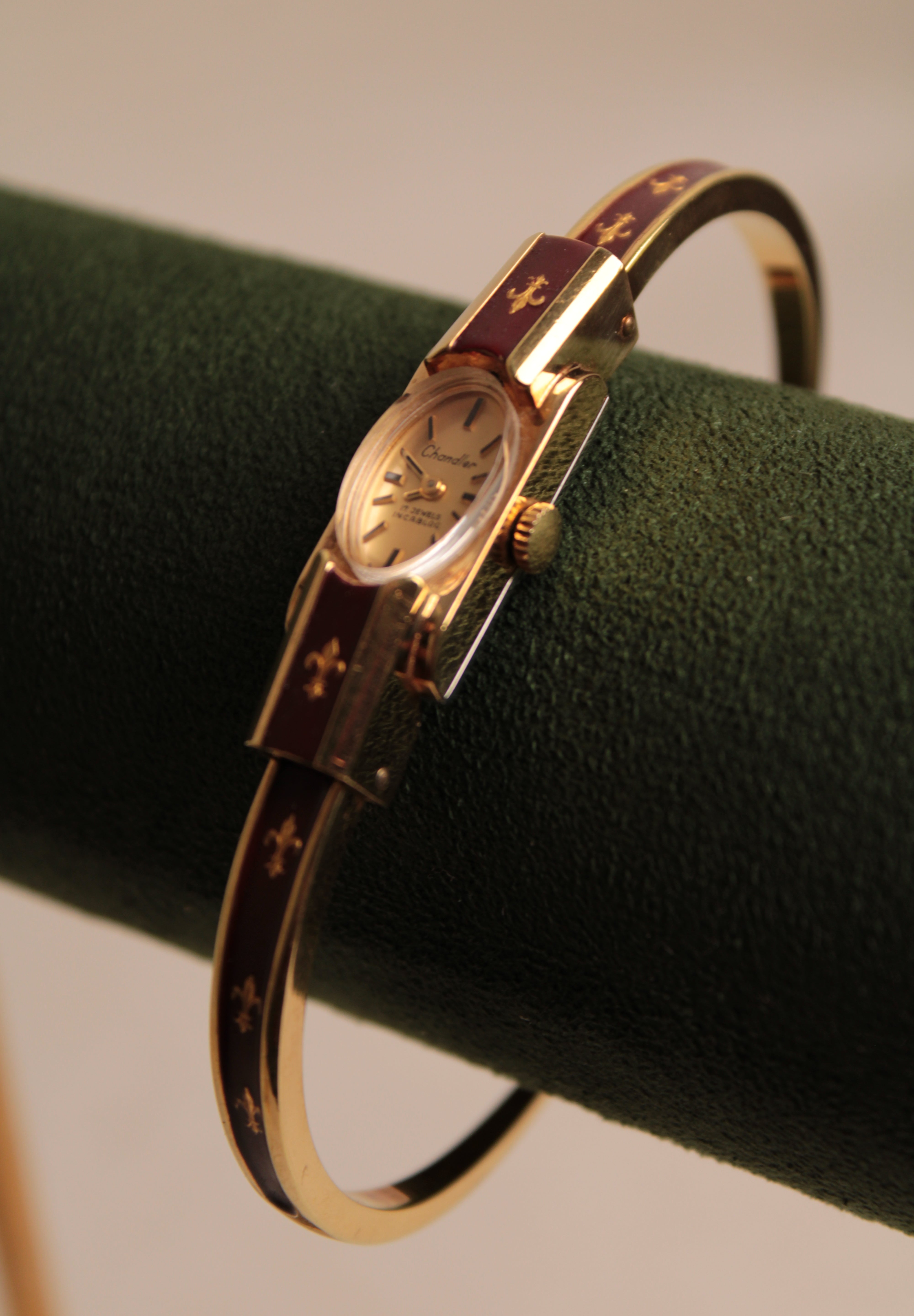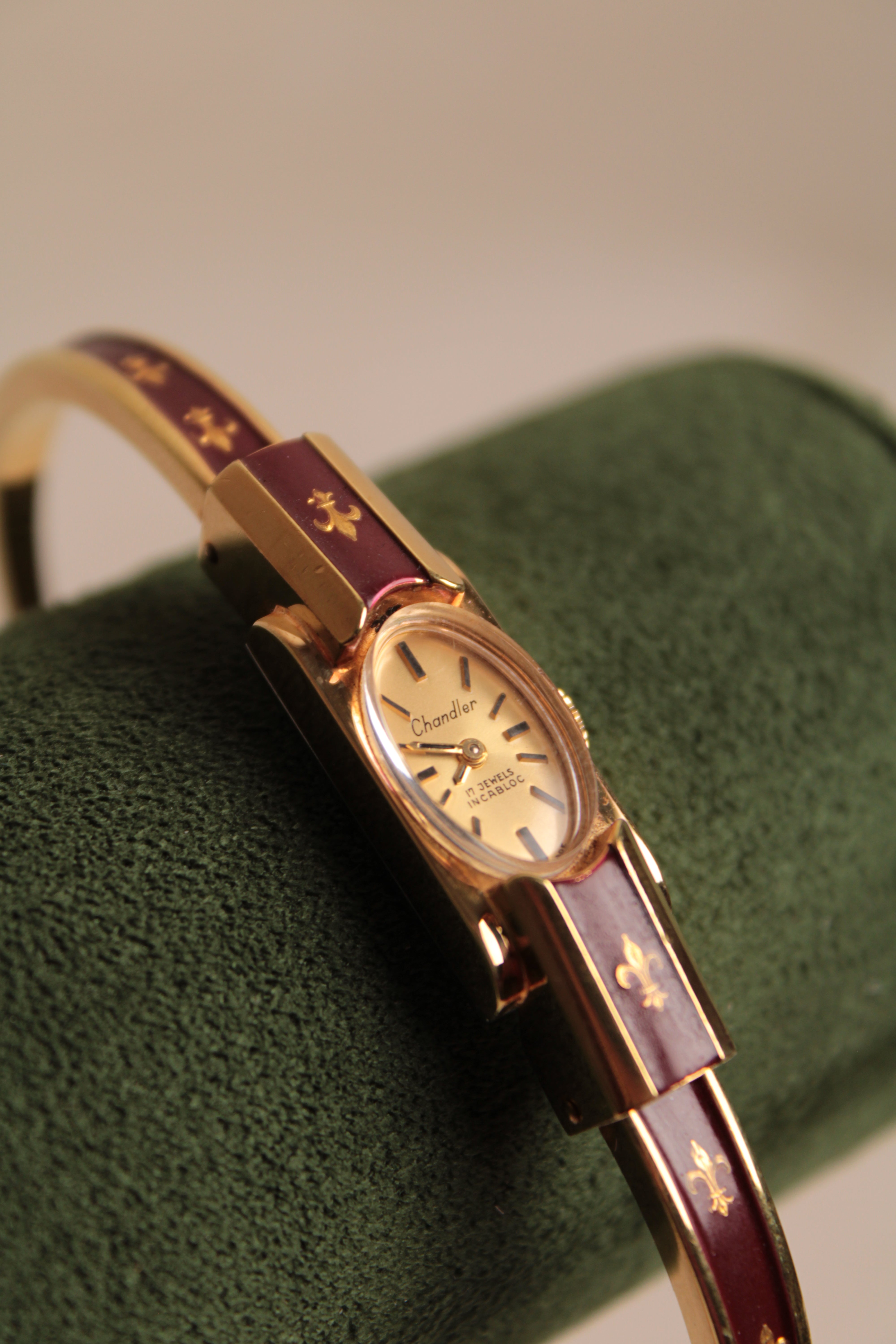 The Vintage Chandler Watch captures the essence of refined elegance with its striking gold tone bangle design and luxurious deep red enamel dial. Adorned with ornate fleur de lis accents, this timepiece draws inspiration from classical European aesthetics, offering a distinctive blend of heritage and sophistication. The rich crimson backdrop provides a bold yet graceful canvas that complements the intricate detailing, creating a watch that commands attention without sacrificing understated charm. The comfortable bangle band ensures effortless wearability throughout the day, while the vintage-inspired construction appeals to discerning collectors and those with an appreciation for historical design. This exceptional piece transitions seamlessly from evening affairs to refined daytime wear, serving as a conversation-starting accessory that reflects impeccable taste and an eye for timeless craftsmanship.