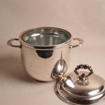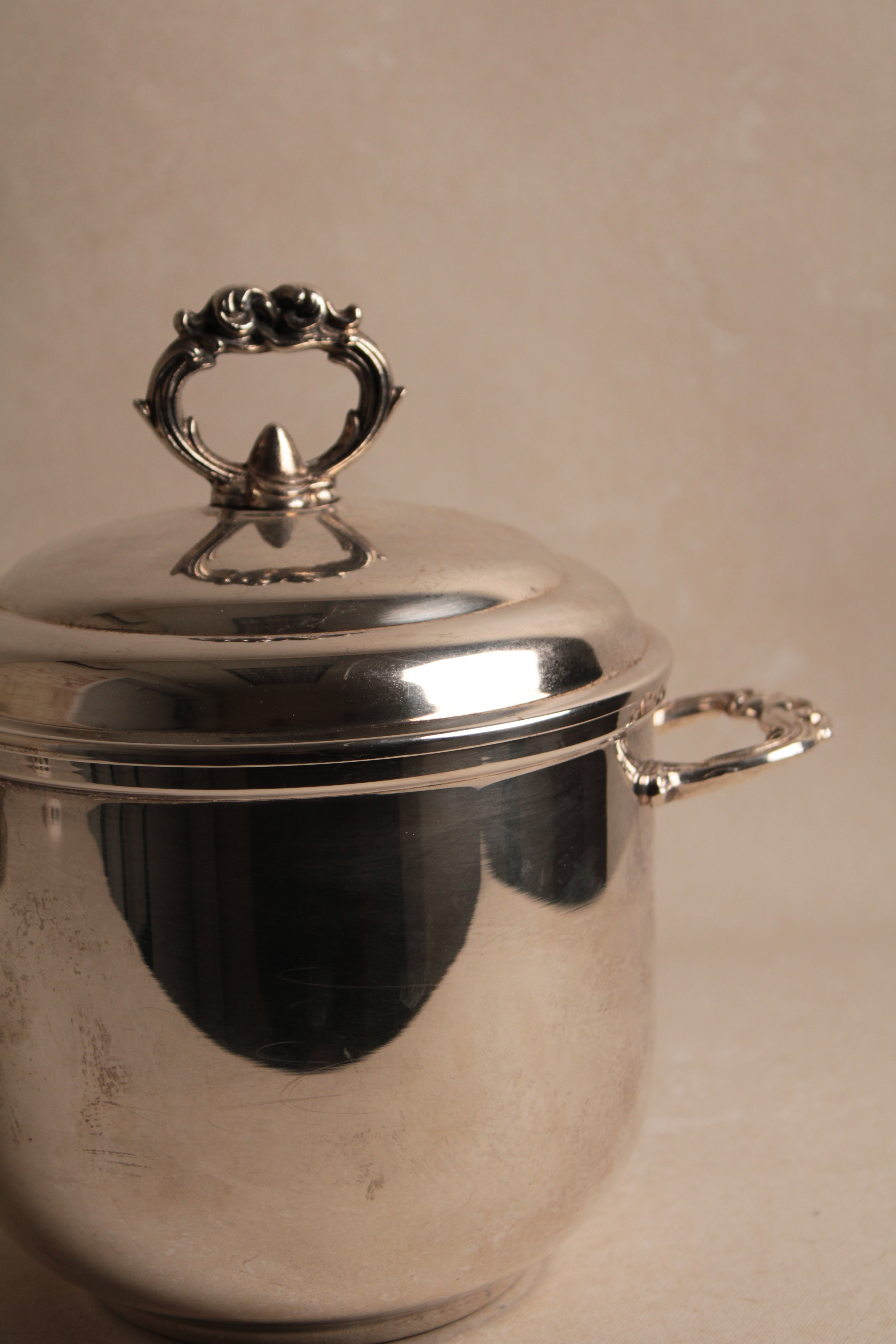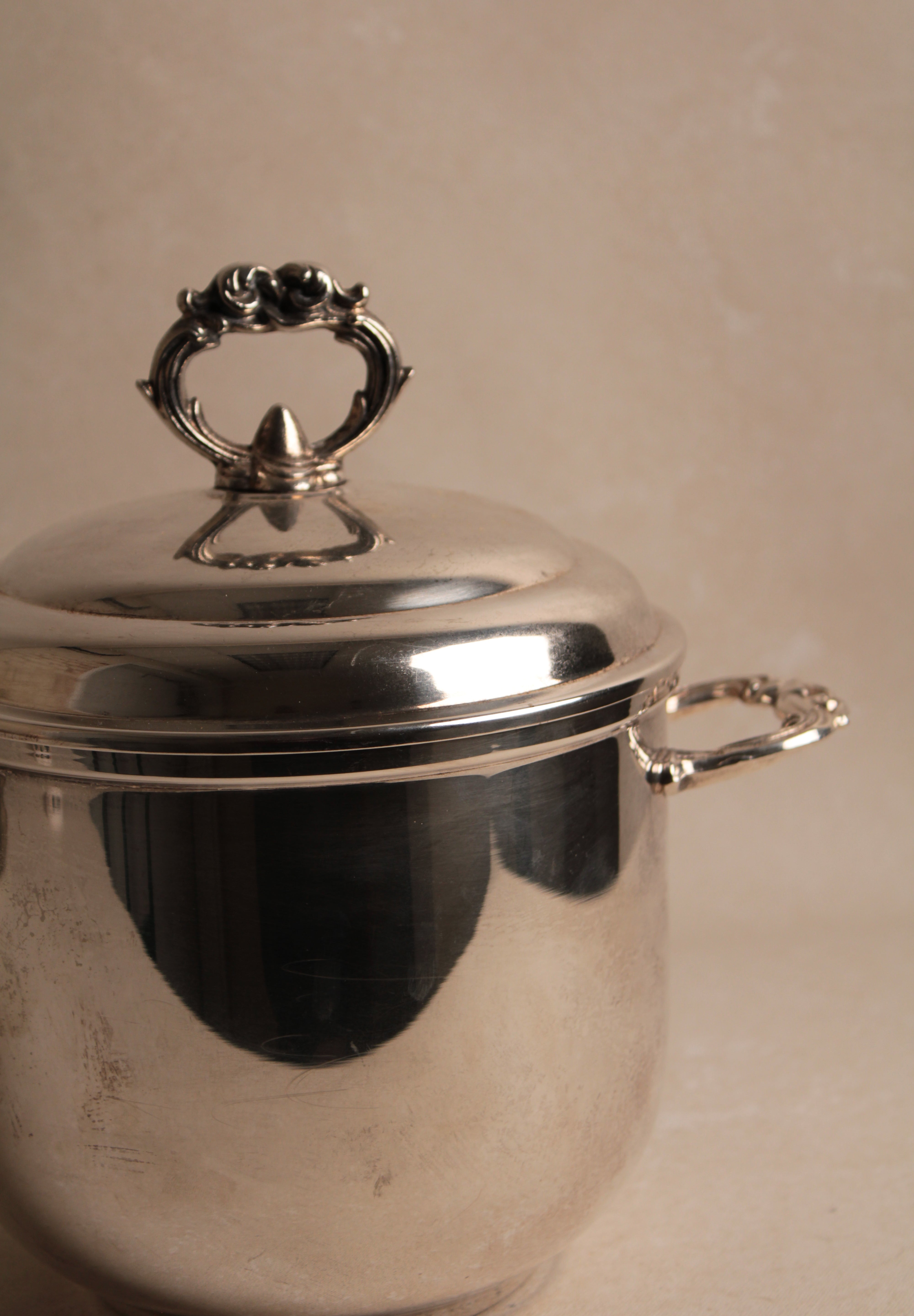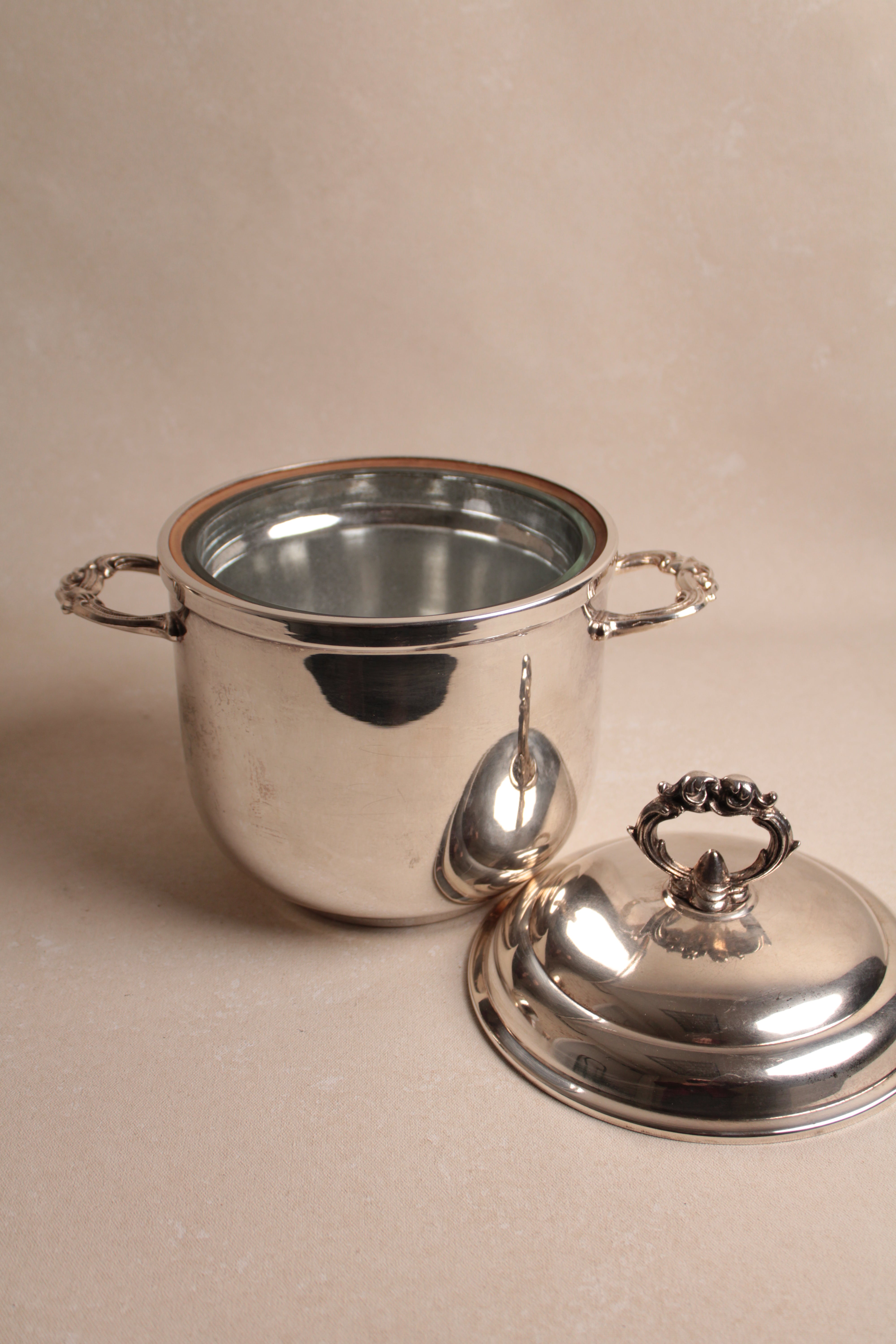 A distinguished vintage silver-plated ice bucket rendered in the refined aesthetic of Regency style, exemplifying the elegance and restraint characteristic of this enduring design tradition. This champagne cooler combines functional excellence with visual sophistication, featuring the graceful proportions and understated ornamentation that define Regency design sensibilities. The silver plate finish provides lustrous appeal while maintaining the durability necessary for frequent entertaining. The bucket's generous capacity accommodates standard champagne bottles while its refined silhouette enhances any table setting with timeless grace. Perfect for collectors of vintage barware, those who appreciate Regency design heritage, or anyone seeking an authentic period piece that elevates champagne service to an art form. An exceptional acquisition that merges practical functionality with genuine aesthetic refinement—a testament to enduring craftsmanship and the timeless appeal of classically inspired entertaining accessories worthy of the most discerning hosts.