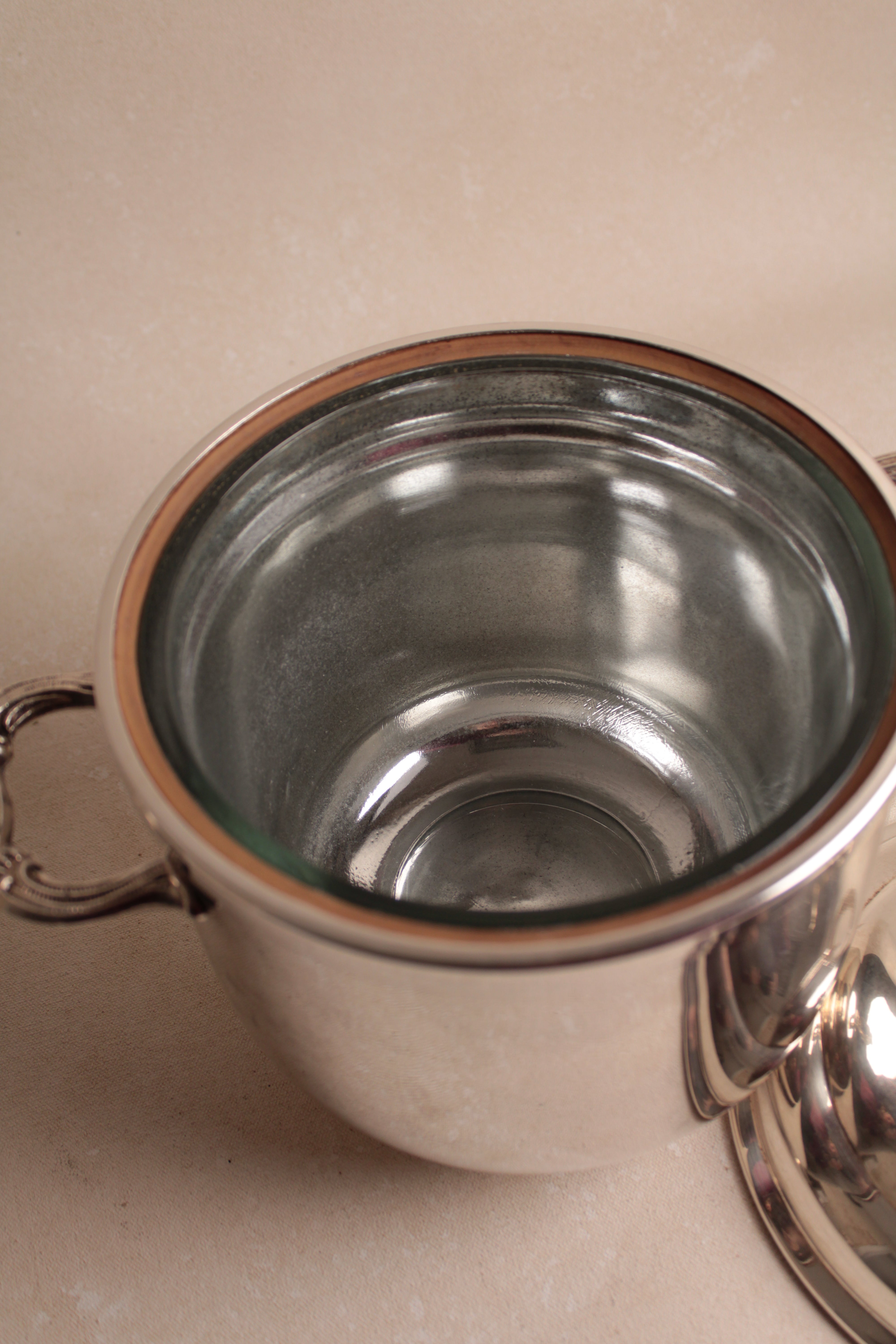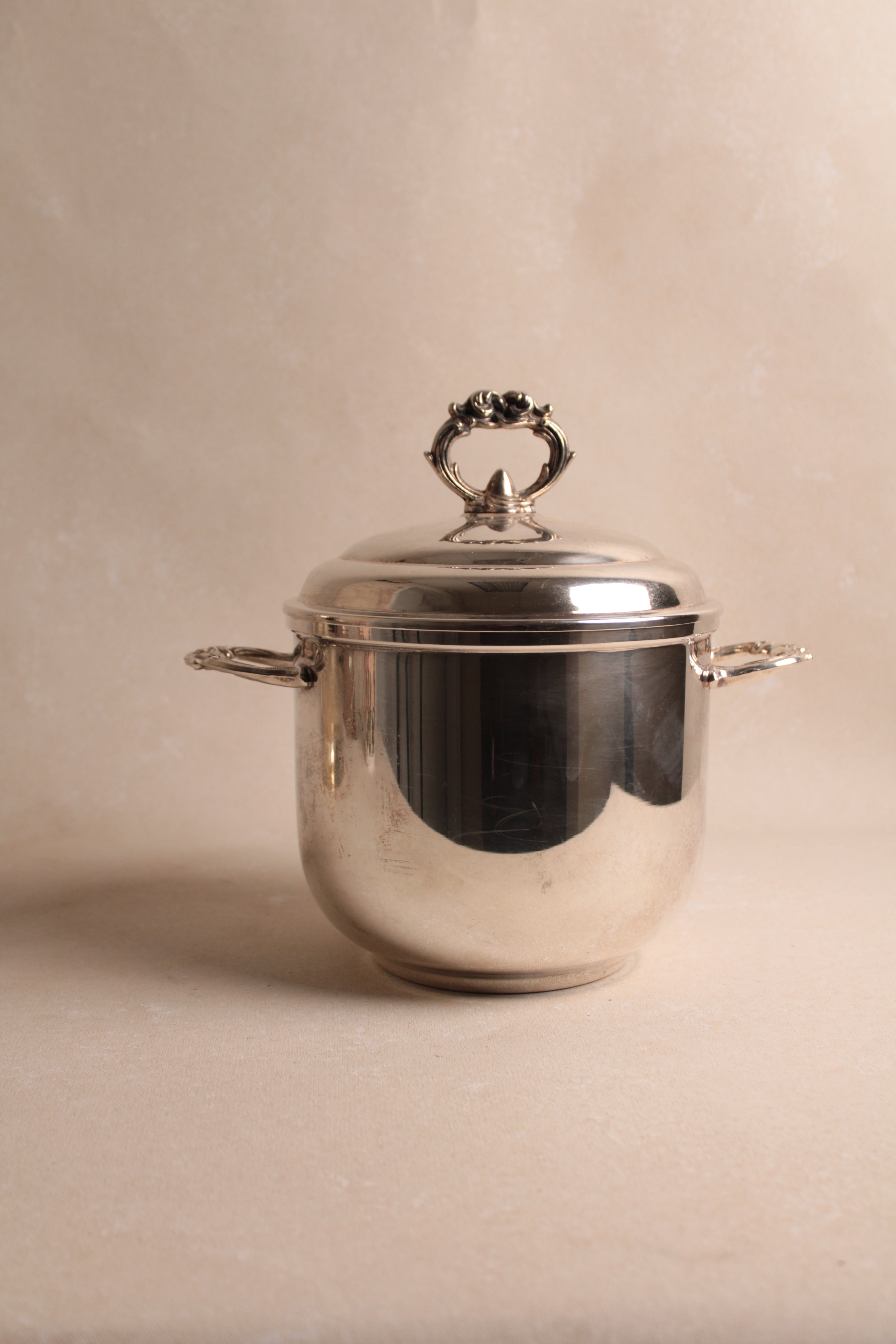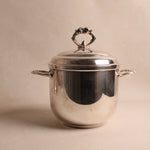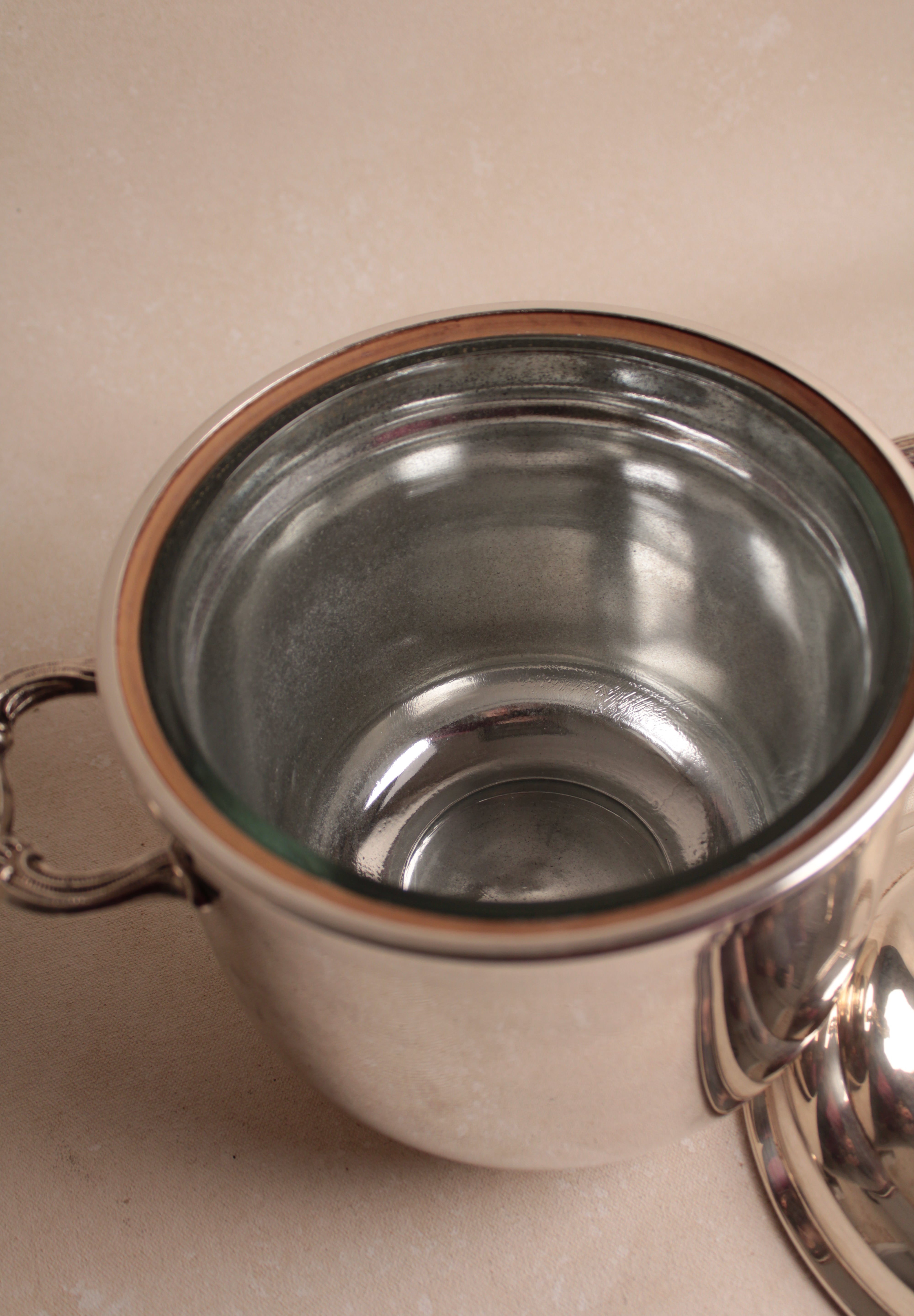 A distinguished vintage silver-plated ice bucket rendered in the refined aesthetic of Regency style, exemplifying the elegance and restraint characteristic of this enduring design tradition. This champagne cooler combines functional excellence with visual sophistication, featuring the graceful proportions and understated ornamentation that define Regency design sensibilities. The silver plate finish provides lustrous appeal while maintaining the durability necessary for frequent entertaining. The bucket's generous capacity accommodates standard champagne bottles while its refined silhouette enhances any table setting with timeless grace. Perfect for collectors of vintage barware, those who appreciate Regency design heritage, or anyone seeking an authentic period piece that elevates champagne service to an art form. An exceptional acquisition that merges practical functionality with genuine aesthetic refinement—a testament to enduring craftsmanship and the timeless appeal of classically inspired entertaining accessories worthy of the most discerning hosts.