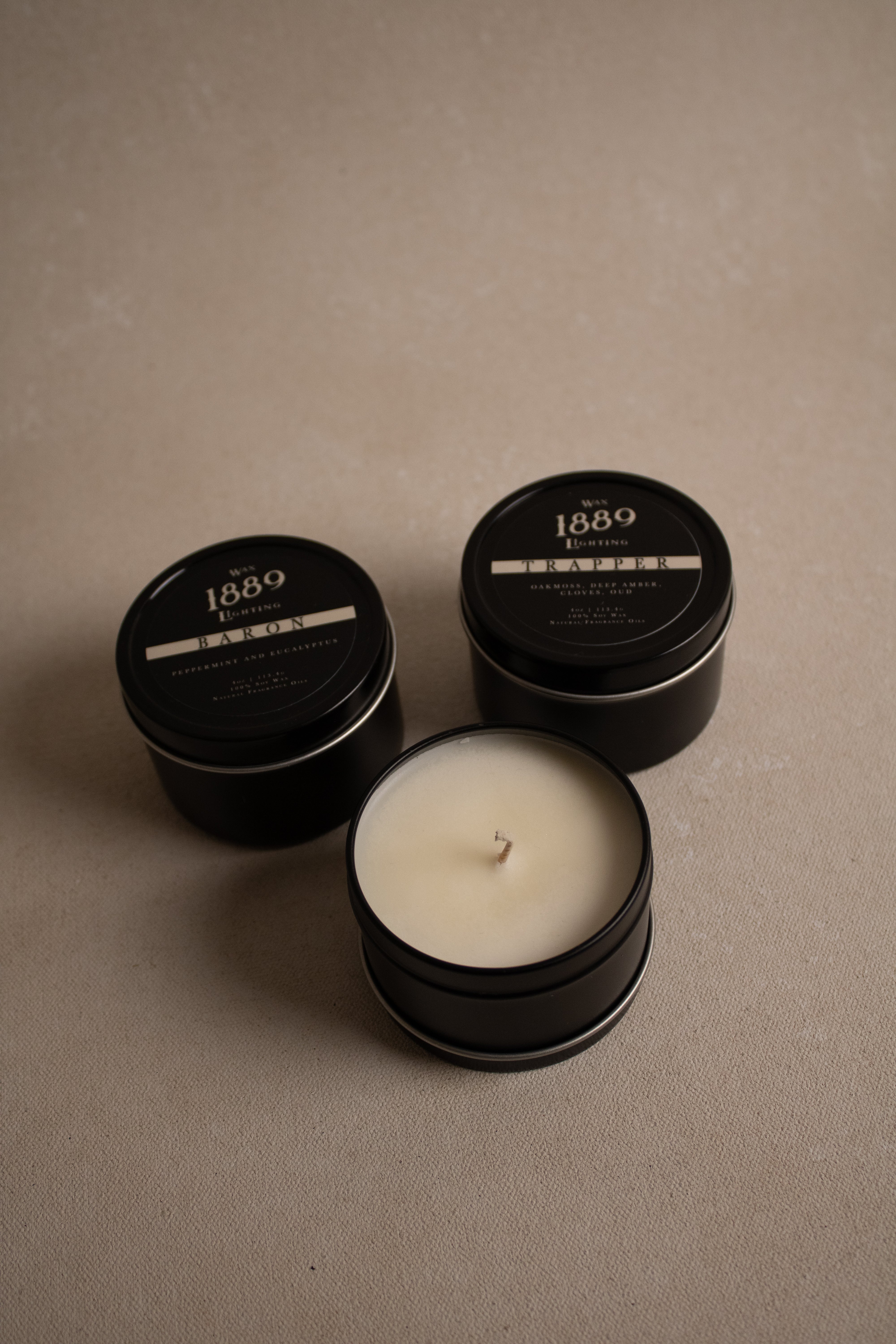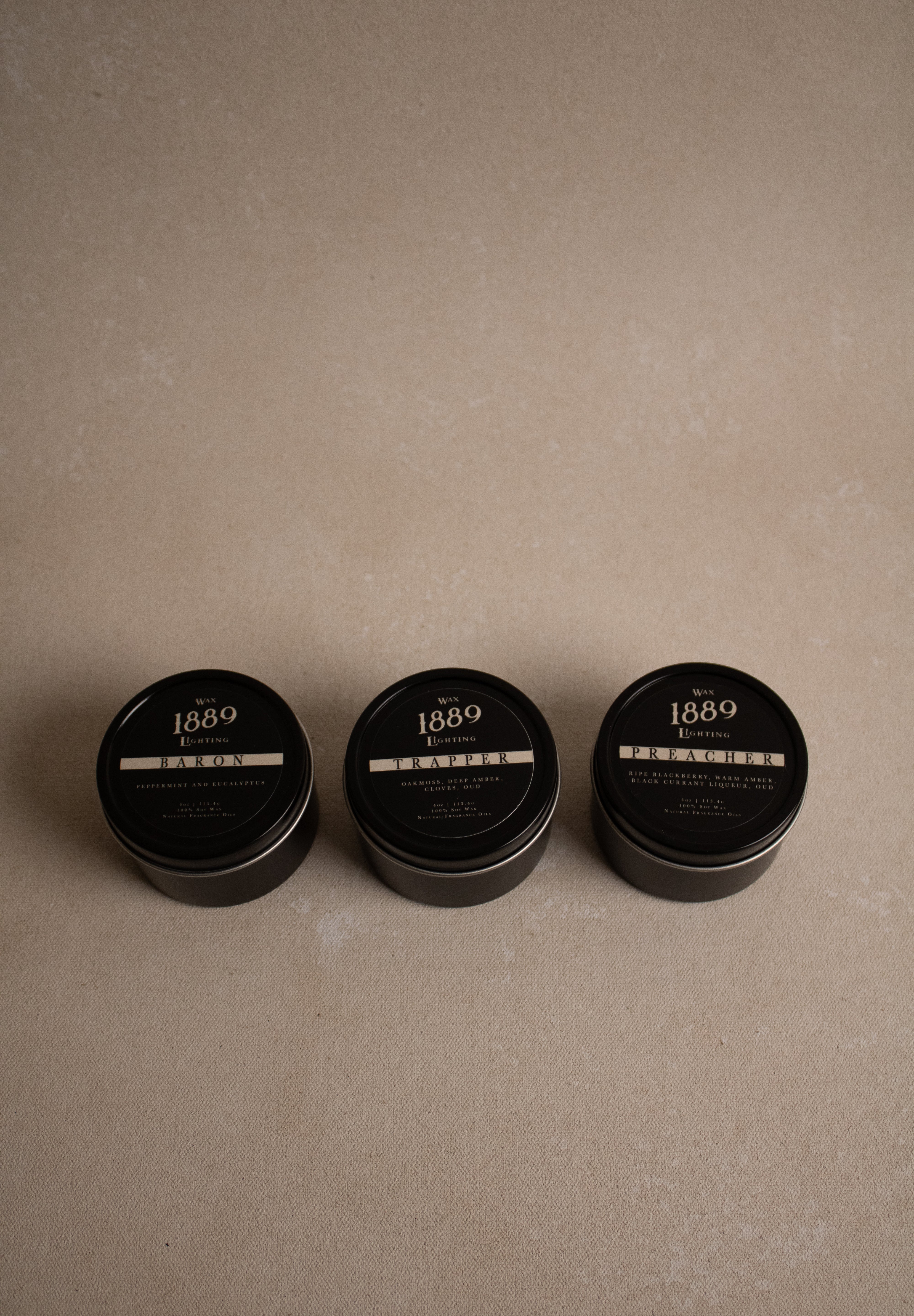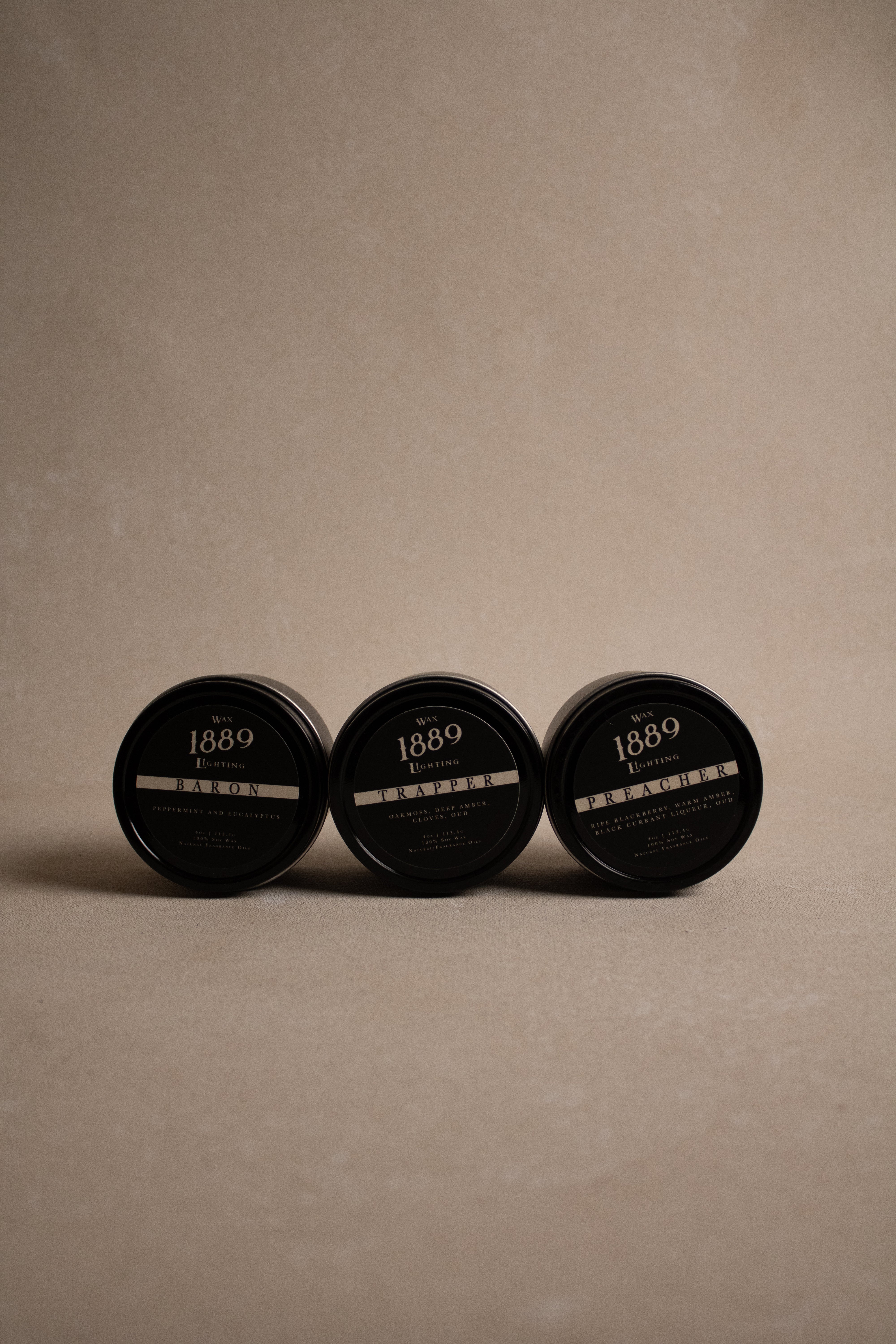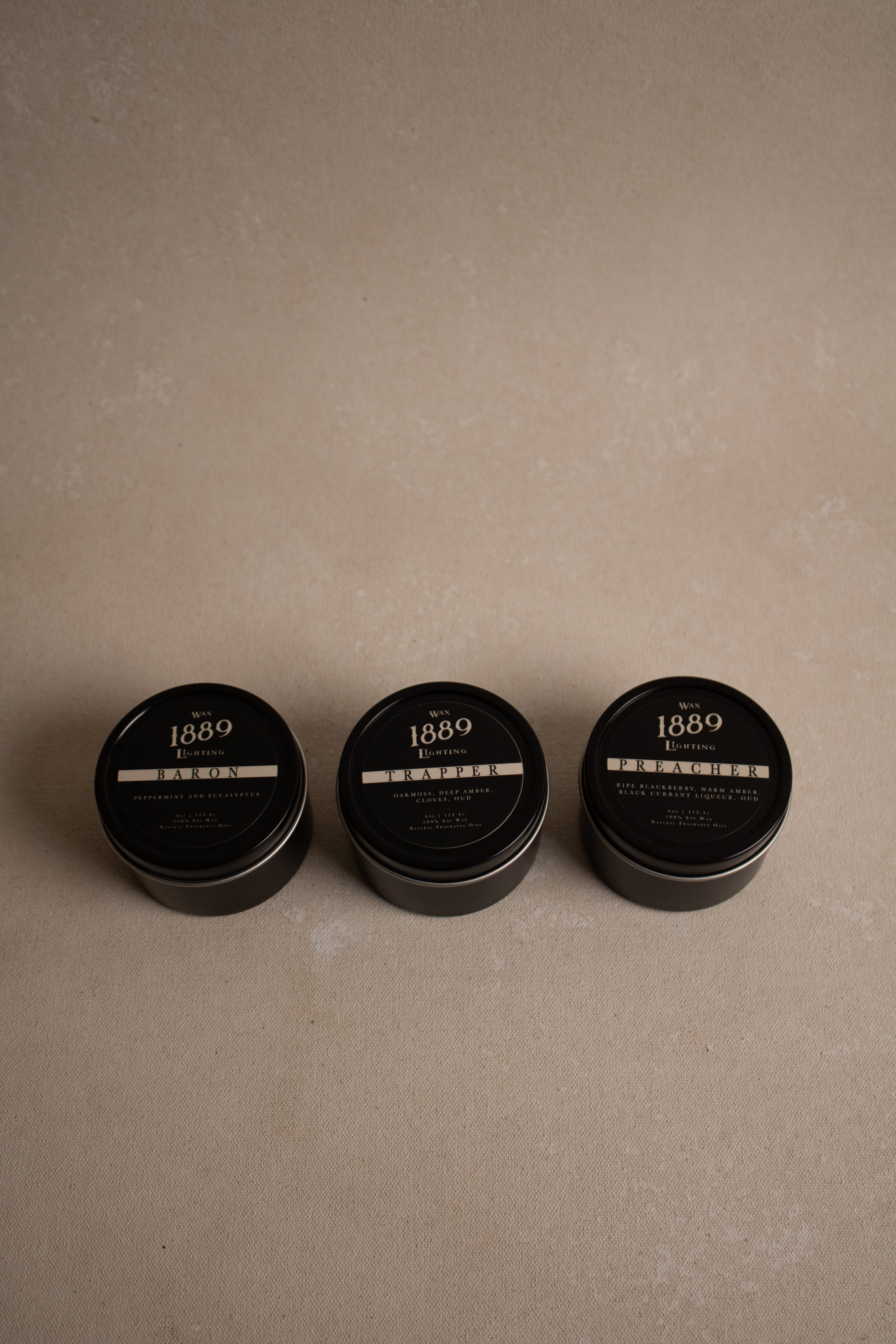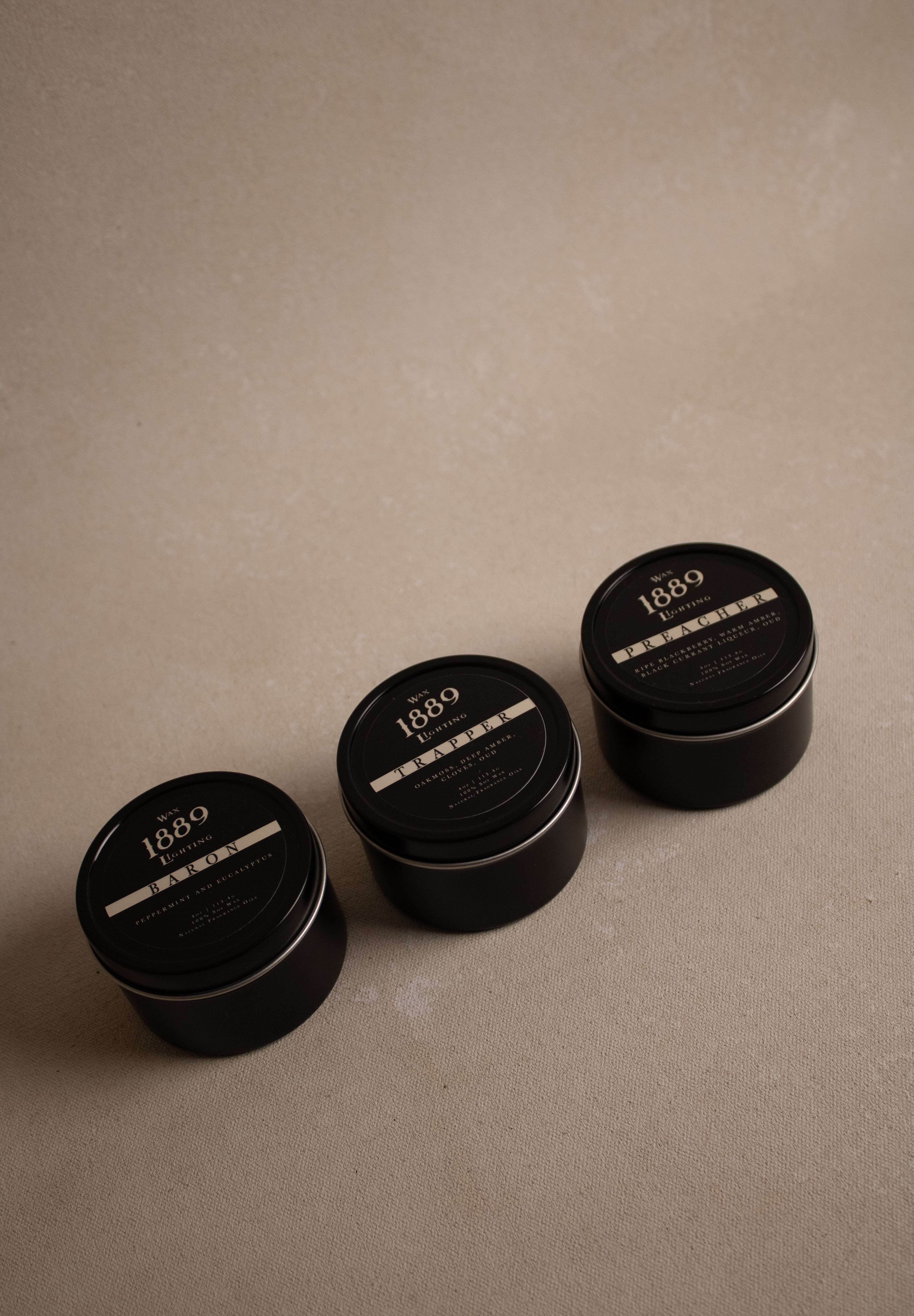 The 1889 Tin Candle captures the essence of rugged elegance with three distinctive fragrances, each telling its own story. Trapper evokes the deep woods with oud, oakmoss, and cedar—a grounding blend perfect for contemplative evenings. Baron brings invigorating warmth through peppermint, eucalyptus, and clove, ideal for those seeking an uplifting atmosphere. Preacher rounds out the collection with its luxurious combination of ripe blackberry, warm amber, black currant, and oud, creating a sophisticated backdrop for any room. Each 4oz candle burns cleanly and steadily, delivering hours of refined ambiance. Whether you're drawn to woody depths, spiced vitality, or fruited warmth, this collection offers a refined choice for the discerning home.