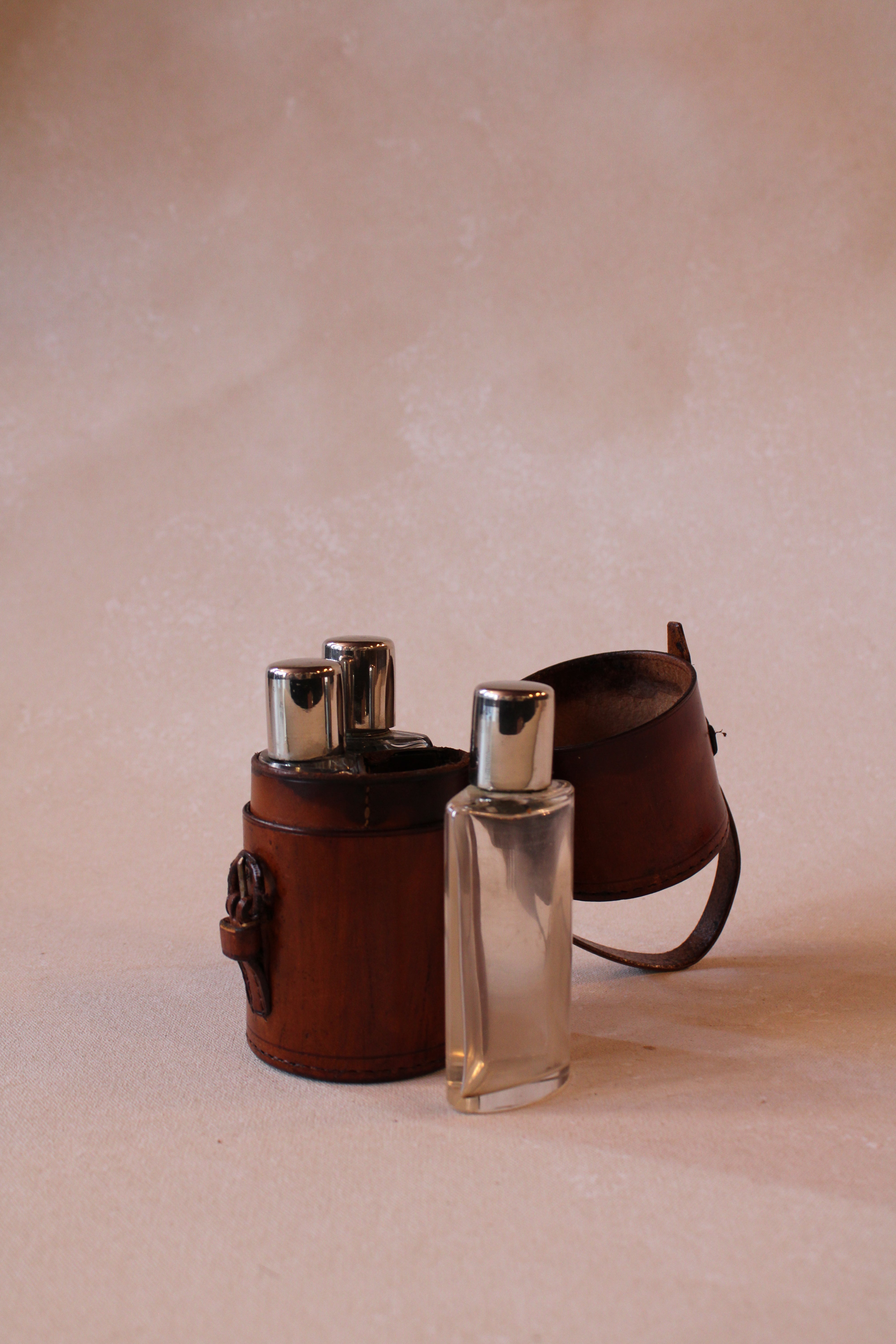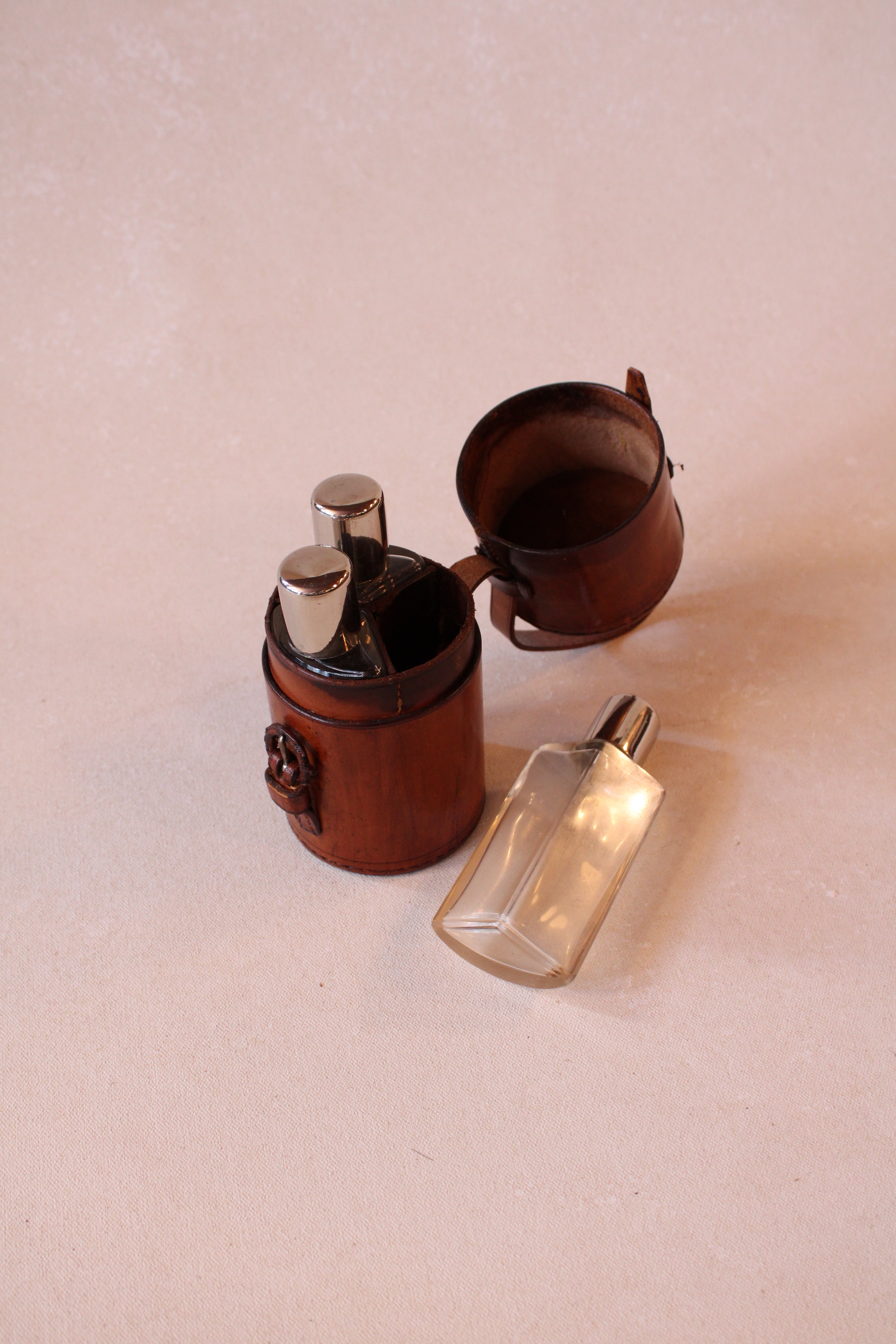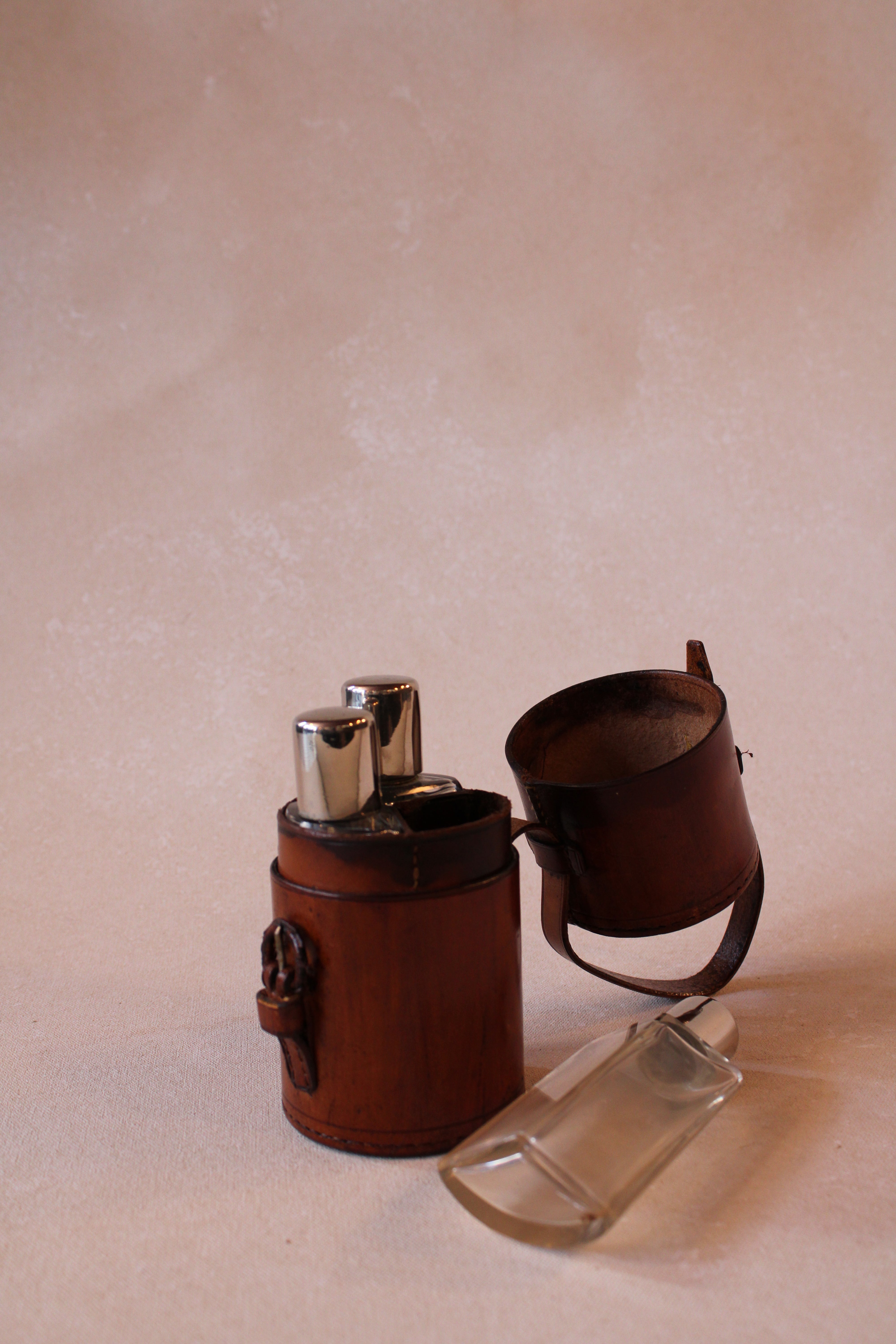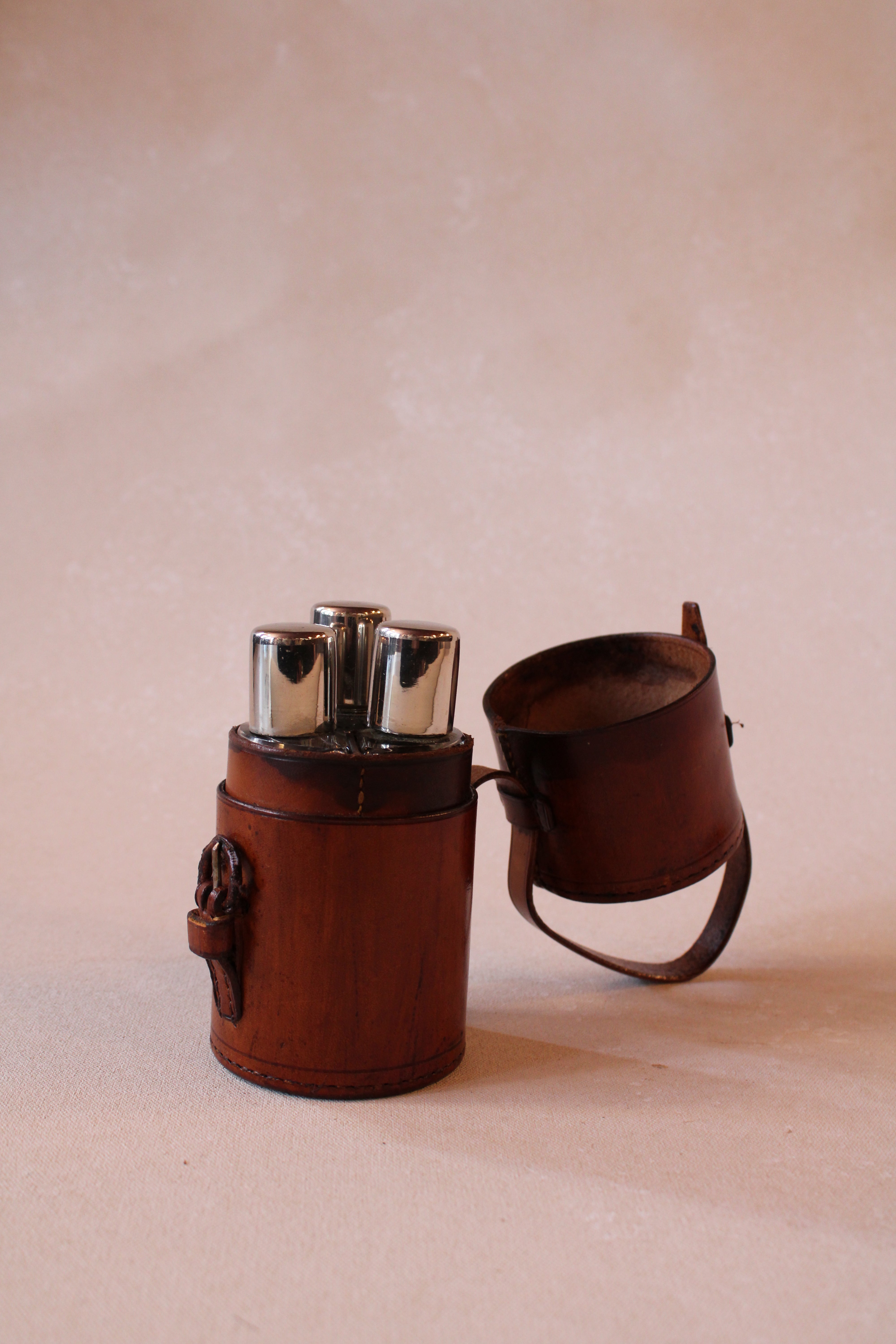 Experience timeless elegance with this Antique Set of Three Glass Flasks housed in a rich brown leather case. Each flask is crafted from fine glass, offering a classic way to carry your favorite beverages with style and sophistication. The protective leather case adds durability and vintage charm, making this set perfect for collectors or those who appreciate refined accessories. Whether for display or practical use, these flasks combine historical appeal with functional design, making them an exceptional addition to any collection or a thoughtful gift for enthusiasts of antique craftsmanship.