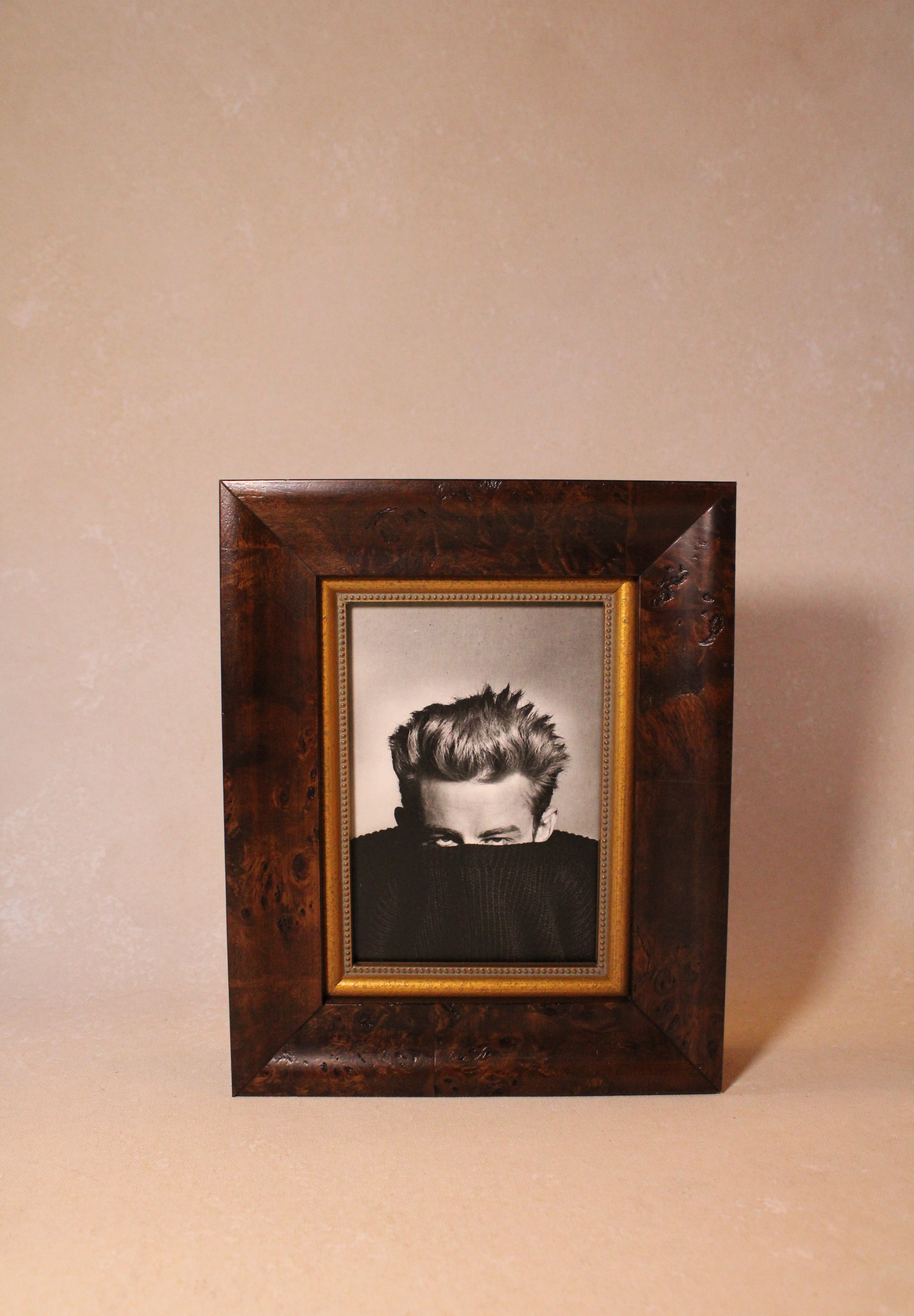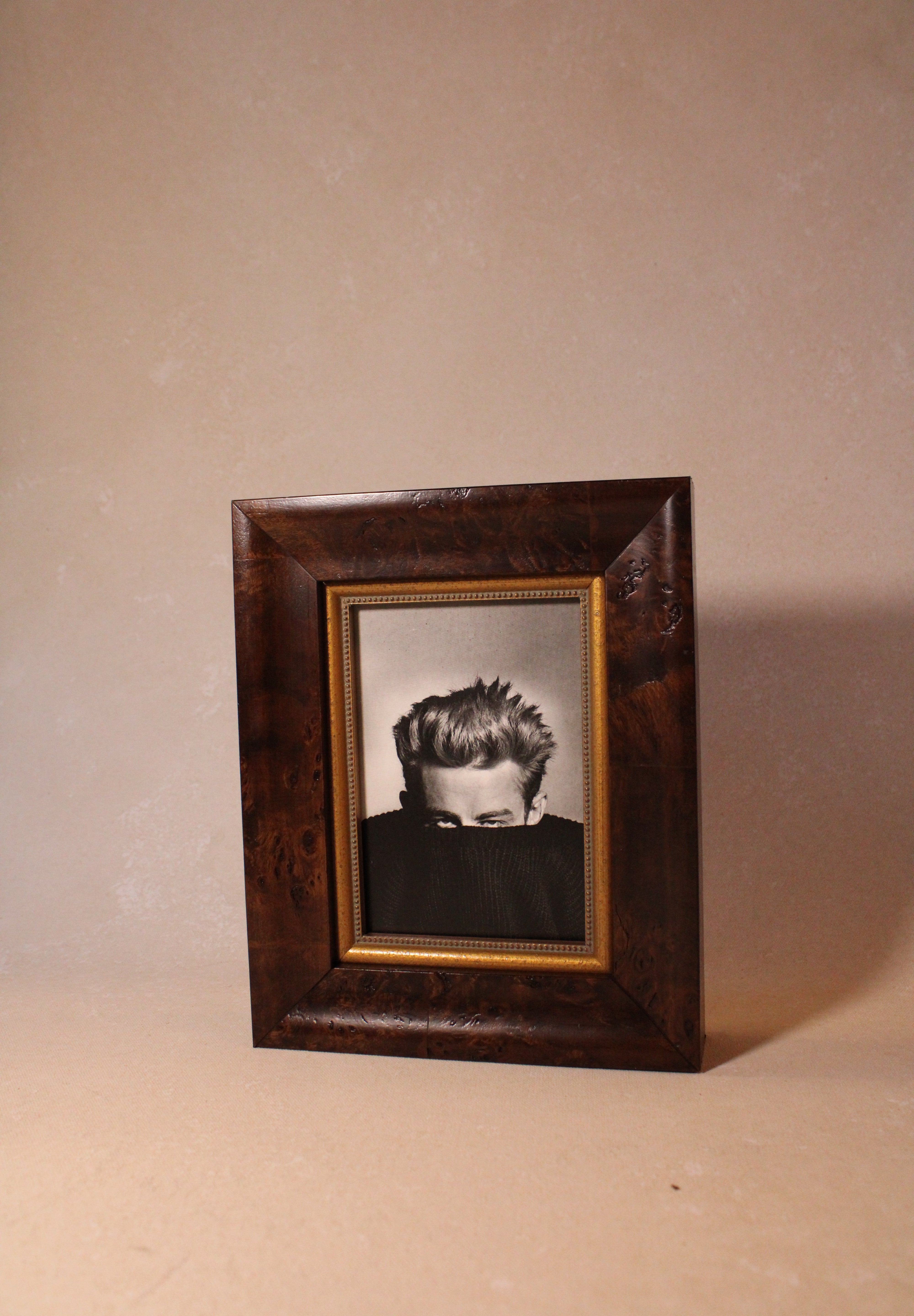 The James Print Framed in a rich brown frame offers a striking blend of modern artistry and subtle intrigue. This piece features a man gazing upward, his face partially concealed by a turtleneck, evoking a sense of mystery and refined style. The warm brown frame enhances the artwork’s depth, making it a captivating focal point for any sophisticated living space or office. Crafted to elevate your décor, this print harmonizes contemporary minimalism with thoughtful expression, inviting thoughtful reflection and conversation.